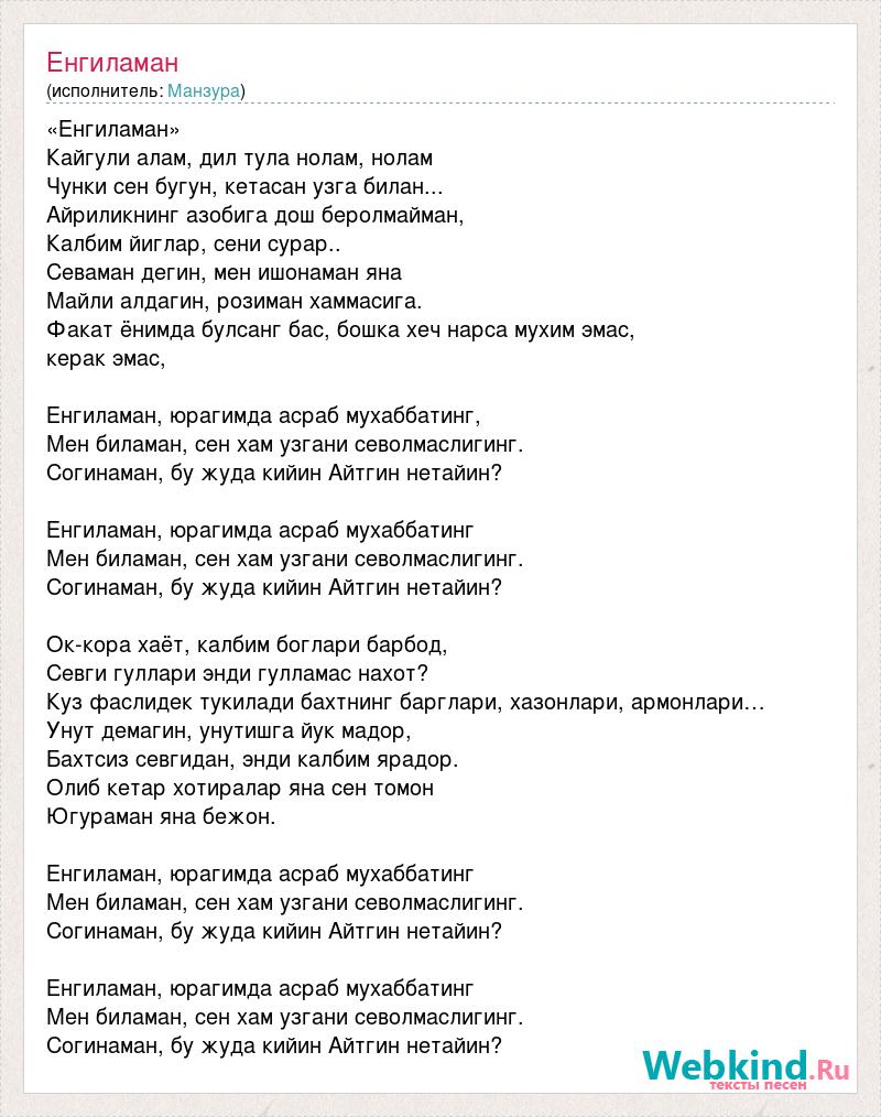 «Енгиламан» Кайгули алам, дил тула нолам, нолам Чунки сен бугун, кетасан узга билан... Айриликнинг азобига дош беролмайман, Калбим йиглар, сени сурар.. Севаман дегин, мен ишонаман яна Майли алдагин, розиман хаммасига. Факат ёнимда булсанг бас, бошка хеч нарса мухим эмас, керак эмас, Енгиламан, юрагимда асраб мухаббатинг, Мен биламан, сен хам узгани севолмаслигинг. Согинаман, бу жуда кийин Айтгин нетайин? Енгиламан, юрагимда асраб мухаббатинг Мен биламан, сен хам узгани севолмаслигинг. Согинаман, бу жуда кийин Айтгин нетайин? Ок-кора хаёт, калбим боглари барбод, Севги гуллари энди гулламас нахот? Куз фаслидек тукилади бахтнинг барглари, хазонлари, армонлари… Унут демагин, унутишга йук мадор, Бахтсиз севгидан, энди калбим ярадор. Олиб кетар хотиралар яна сен томон Югураман яна бежон. Енгиламан, юрагимда асраб мухаббатинг Мен биламан, сен хам узгани севолмаслигинг. Согинаман, бу жуда кийин Айтгин нетайин? Енгиламан, юрагимда асраб мухаббатинг Мен биламан, сен хам узгани севолмаслигинг. Согинаман, бу жуда кийин Айтгин нетайин?