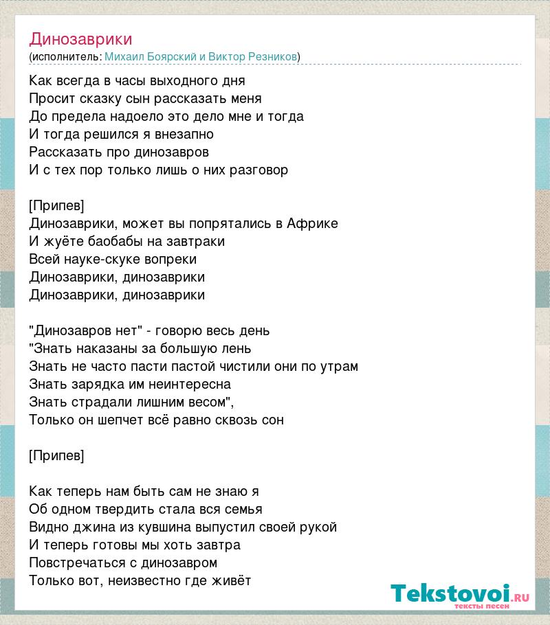 Как всегда в часы выходного дня Просит сказку сын рассказать меня До предела надоело это дело мне и тогда И тогда решился я внезапно Рассказать про динозавров И с тех пор только лишь о них разговор [Припев] Динозаврики, может вы попрятались в Африке И жуёте баобабы на завтраки Всей науке-скуке вопреки Динозаврики, динозаврики Динозаврики, динозаврики "Динозавров нет" - говорю весь день "Знать наказаны за большую лень Знать не часто пасти пастой чистили они по утрам Знать зарядка им неинтересна Знать страдали лишним весом", Только он шепчет всё равно сквозь сон [Припев] Как теперь нам быть сам не знаю я Об одном твердить стала вся семья Видно джина из кувшина выпустил своей рукой И теперь готовы мы хоть завтра Повстречаться с динозавром Только вот, неизвестно где живёт