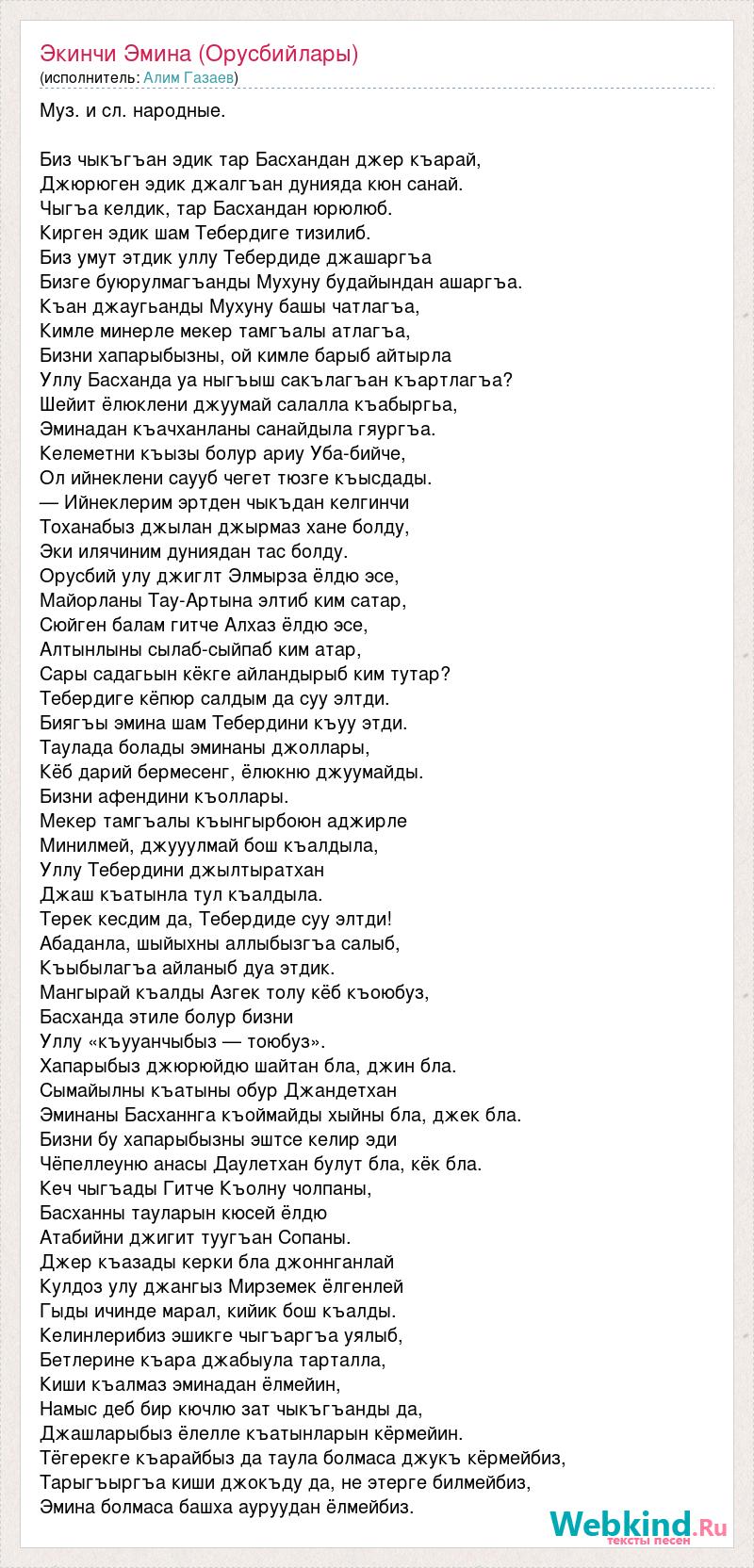 Муз. и сл. народные. Биз чыкъгъан эдик тар Басхандан джер къарай, Джюрюген эдик джалгъан дунияда кюн санай. Чыгъа келдик, тар Басхандан юрюлюб. Кирген эдик шам Тебердиге тизилиб. Биз умут этдик уллу Тебердиде джашаргъа Бизге буюрулмагъанды Мухуну будайындан ашаргъа. Къан джаугьанды Мухуну башы чатлагъа, Кимле минерле мекер тамгъалы атлагъа, Бизни хапарыбызны, ой кимле барыб айтырла Уллу Басханда уа ныгъыш сакълагъан къартлагъа? Шейит ёлюклени джуумай салалла къабыргьа, Эминадан къачханланы санайдыла гяургъа. Келеметни къызы болур ариу Уба-бийче, Ол ийнеклени саууб чегет тюзге къысдады. — Ийнеклерим эртден чыкъдан келгинчи Тоханабыз джылан джырмаз хане болду, Эки илячиним дуниядан тас болду. Орусбий улу джиглт Элмырза ёлдю эсе, Майорланы Тау-Артына элтиб ким сатар, Сюйген балам гитче Алхаз ёлдю эсе, Алтынлыны сылаб-сыйпаб ким атар, Сары садагьын кёкге айландырыб ким тутар? Тебердиге кёпюр салдым да суу элтди. Биягъы эмина шам Тебердини къуу этди. Таулада болады эминаны джоллары, Кёб дарий бермесенг, ёлюкню джуумайды. Бизни афендини къоллары. Мекер тамгъалы къынгырбоюн аджирле Минилмей, джууулмай бош къалдыла, Уллу Тебердини джылтыратхан Джаш къатынла тул къалдыла. Терек кесдим да, Тебердиде суу элтди! Абаданла, шыйыхны аллыбызгъа салыб, Къыбылагъа айланыб дуа этдик. Мангырай къалды Азгек толу кёб къоюбуз, Басханда этиле болур бизни Уллу «къууанчыбыз — тоюбуз». Хапарыбыз джюрюйдю шайтан бла, джин бла. Сымайылны къатыны обур Джандетхан Эминаны Басханнга къоймайды хыйны бла, джек бла. Бизни бу хапарыбызны эштсе келир эди Чёпеллеуню анасы Даулетхан булут бла, кёк бла. Кеч чыгъады Гитче Къолну чолпаны, Басханны тауларын кюсей ёлдю Атабийни джигит туугъан Сопаны. Джер къазады керки бла джоннганлай Кулдоз улу джангыз Мирземек ёлгенлей Гыды ичинде марал, кийик бош къалды. Келинлерибиз эшикге чыгъаргъа уялыб, Бетлерине къара джабыула тарталла, Киши къалмаз эминадан ёлмейин, Намыс деб бир кючлю зат чыкъгъанды да, Джашларыбыз ёлелле къатынларын кёрмейин. Тёгерекге къарайбыз да таула болмаса джукъ кёрмейбиз, Тарыгъыргъа киши джокъду да, не этерге билмейбиз, Эмина болмаса башха ауруудан ёлмейбиз.