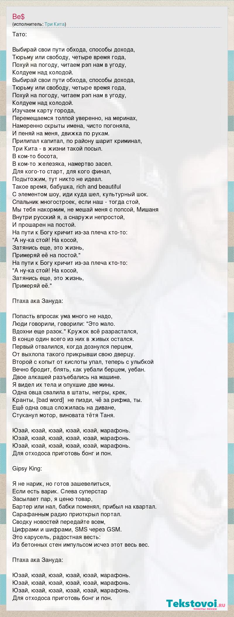 Тато: Выбирай свои пути обхода, способы дохода, Тюрьму или свободу, четыре время года, Похуй на погоду, читаем рэп нам в угоду, Колдуем над колодой. Выбирай свои пути обхода, способы дохода, Тюрьму или свободу, четыре время года, Похуй на погоду, читаем рэп нам в угоду, Колдуем над колодой. Изучаем карту города, Перемещаемся толпой уверенно, на меринах, Намеренно скрыты имена, чисто погоняла, И пеняй на меня, движка по рукам. Прилипал капитал, по району шарит криминал, Три Кита - в жизни такой посыл. В ком-то босота, В ком-то железяка, намертво засел. Для кого-то старт, для кого финал, Подытожим, тут никто не идеал. Такое время, бабушка, rich and beautiful С элементом шоу, иди куда шел, культурный шок. Спальник многостроек, если наш - тогда стой, Мы тебя накормим, не мешай меня с попсой, Мишаня Внутри русский я, а снаружи непростой, И прошарен на постой. На пути к Богу кричит из-за плеча кто-то: "А ну-ка стой! На косой, Затянись еще, это жизнь, Примеряй её на постой." На пути к Богу кричит из-за плеча кто-то: "А ну-ка стой! На косой, Затянись еще, это жизнь, Примеряй её." Птаха ака Зануда: Попасть впросак ума много не надо, Люди говорили, говорили: "Это мало. Вдохни еще разок." Кружок всё разрастался, В конце один всего из них в живых остался. Первый отвалился, когда дознулся перцем, От выхлопа такого прикрывши свою дверцу. Второй с копыт от кислоты упал, теперь с улыбкой Вечно бродит, блять, как уебали берцем, уебан. Двое алкашей разъебались на машине. Я видел их тела и опухшие две мины. Одна овца свалила в штаты, негры, крек, Кранты, [bad word] не пизди, чё за рифма, ты. Ещё одна овца сложилась на диване, Стуканул мотор, виновата тётя Таня. Юзай, юзай, юзай, юзай, юзай, марафонь. Юзай, юзай, юзай, юзай, юзай, марафонь. Юзай, юзай, юзай, юзай, юзай, марафонь. Для отходоса приготовь бонг и пон. Gipsy King: Я не нарик, но готов зашевелиться, Если есть варик. Слева суперстар Засылает пар, я ценю товар, Бартер или нал, бабки поменял, прибыл на квартал. Сарафанным радио приоткрыл портал. Сводку новостей передайте всем, Цифрами и шифрами, SMS через GSM. Это карусель, радостная весть: Из бетонных стен импульсом исчез этот весь вес. Птаха ака Зануда: Юзай, юзай, юзай, юзай, юзай, марафонь. Юзай, юзай, юзай, юзай, юзай, марафонь. Юзай, юзай, юзай, юзай, юзай, марафонь. Для отходоса приготовь бонг и пон.