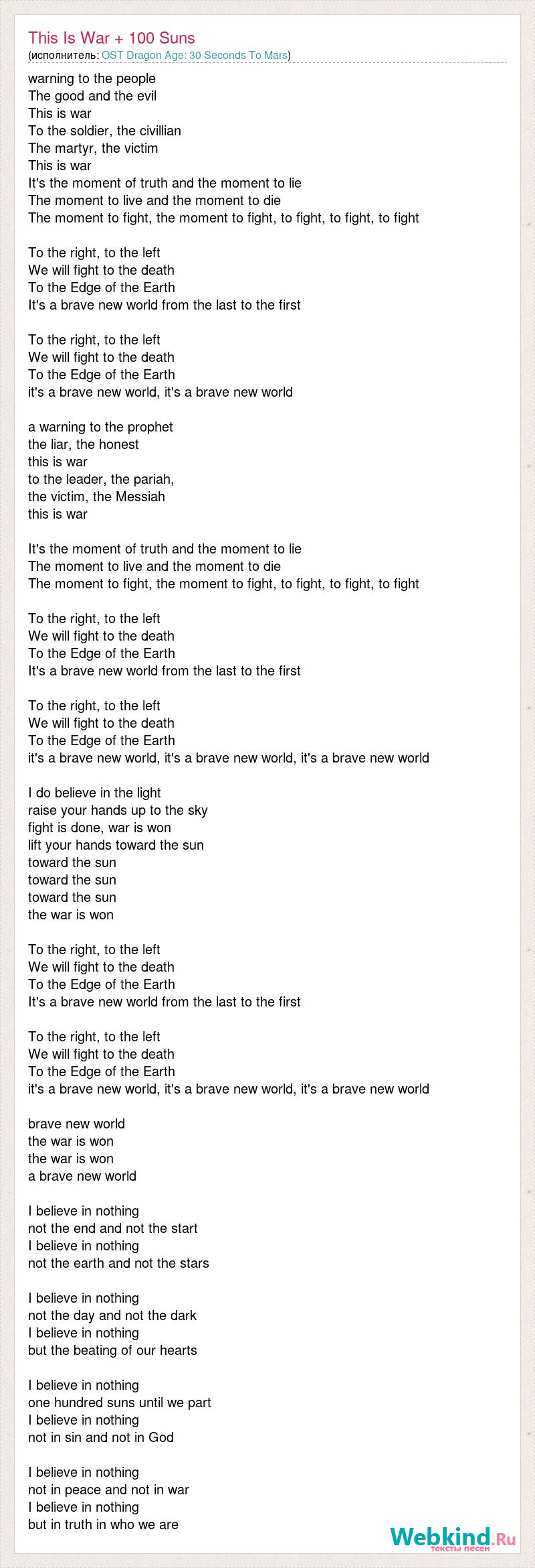 warning to the people The good and the evil This is war To the soldier, the civillian The martyr, the victim This is war It's the moment of truth and the moment to lie The moment to live and the moment to die The moment to fight, the moment to fight, to fight, to fight, to fight To the right, to the left We will fight to the death To the Edge of the Earth It's a brave new world from the last to the first To the right, to the left We will fight to the death To the Edge of the Earth it's a brave new world, it's a brave new world a warning to the prophet the liar, the honest this is war to the leader, the pariah, the victim, the Messiah this is war It's the moment of truth and the moment to lie The moment to live and the moment to die The moment to fight, the moment to fight, to fight, to fight, to fight To the right, to the left We will fight to the death To the Edge of the Earth It's a brave new world from the last to the first To the right, to the left We will fight to the death To the Edge of the Earth it's a brave new world, it's a brave new world, it's a brave new world I do believe in the light raise your hands up to the sky fight is done, war is won lift your hands toward the sun toward the sun toward the sun toward the sun the war is won To the right, to the left We will fight to the death To the Edge of the Earth It's a brave new world from the last to the first To the right, to the left We will fight to the death To the Edge of the Earth it's a brave new world, it's a brave new world, it's a brave new world brave new world the war is won the war is won a brave new world I believe in nothing not the end and not the start I believe in nothing not the earth and not the stars I believe in nothing not the day and not the dark I believe in nothing but the beating of our hearts I believe in nothing one hundred suns until we part I believe in nothing not in sin and not in God I believe in nothing not in peace and not in war I believe in nothing but in truth in who we are