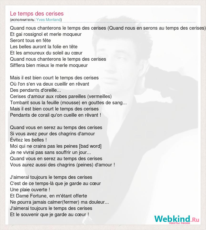 Quand nous chanterons le temps des cerises (Quand nous en serons au temps des cerises) Et gai rossignol et merle moqueur Seront tous en fête Les belles auront la folie en tête Et les amoureux du soleil au cœur Quand nous chanterons le temps des cerises Sifflera bien mieux le merle moqueur Mais il est bien court le temps des cerises Où l'on s'en va deux cueillir en rêvant Des pendants d'oreille... Cerises d'amour aux robes pareilles (vermeilles) Tombant sous la feuille (mousse) en gouttes de sang... Mais il est bien court le temps des cerises Pendants de corail qu'on cueille en rêvant ! Quand vous en serez au temps des cerises Si vous avez peur des chagrins d'amour Évitez les belles ! Moi qui ne crains pas les peines [bad word] Je ne vivrai pas sans souffrir un jour... Quand vous en serez au temps des cerises Vous aurez aussi des chagrins (peines) d'amour ! J'aimerai toujours le temps des cerises C'est de ce temps-là que je garde au cœur Une plaie ouverte ! Et Dame Fortune, en m'étant offerte Ne pourra jamais calmer(fermer) ma douleur... J'aimerai toujours le temps des cerises Et le souvenir que je garde au cœur !