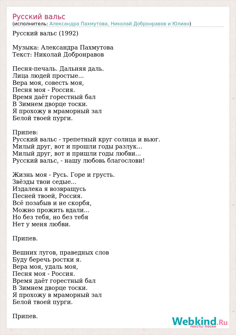 Русский вальс (1992) Музыка: Александра Пахмутова Текст: Николай Добронравов Песня-печаль. Дальняя даль. Лица людей простые... Вера моя, совесть моя, Песня моя - Россия. Время даёт горестный бал В Зимнем дворце тоски. Я прохожу в мраморный зал Белой твоей пурги. Припев: Русский вальс - трепетный круг солнца и вьюг. Милый друг, вот и прошли годы разлук... Милый друг, вот и пришли годы любви... Русский вальс, - нашу любовь благослови! Жизнь моя - Русь. Горе и грусть. Звёзды твои седые... Издалека я возвращусь Песней твоей, Россия. Всё позабыв и не скорбя, Можно прожить вдали... Но без тебя, но без тебя Нет у меня любви. Припев. Вешних лугов, праведных слов Буду беречь ростки я. Вера моя, удаль моя, Песня моя - Россия. Время даёт горестный бал В Зимнем дворце тоски. Я прохожу в мраморный зал Белой твоей пурги. Припев.