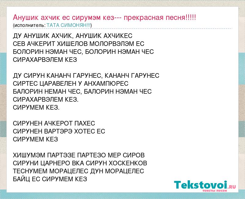 А как ты думаешь, о чем песня "Анушик ахчик ес сирумэм кез--- прекрасная песня!!!!!" ?