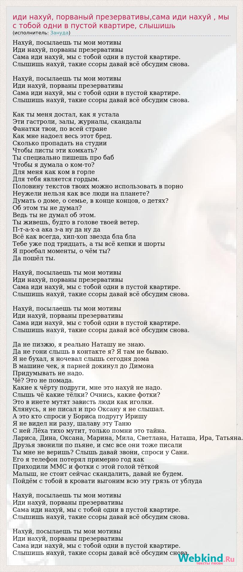 Нахуй, посылаешь ты мои мотивы Иди нахуй, порваны презервативы Сама иди нахуй, мы с тобой одни в пустой квартире. Слышишь нахуй, такие ссоры давай всё обсудим снова. Нахуй, посылаешь ты мои мотивы Иди нахуй, порваны презервативы Сама иди нахуй, мы с тобой одни в пустой квартире. Слышишь нахуй, такие ссоры давай всё обсудим снова. Как ты меня достал, как я устала Эти гастроли, залы, журналы, скандалы Фанатки твои, по всей стране Как мне надоел весь этот бред. Сколько пропадать на студии Чтобы листы эти комкать? Ты специально пишешь про баб Чтобы я думала о ком-то? Для меня как ком в горле Для тебя является гордым. Половину текстов твоих можно использовать в порно Неужели нельзя как все люди на планете? Думать о доме, о семье, в конце концов, о детях? Об этом ты не думал? Ведь ты не думал об этом. Ты живешь, будто в голове твоей ветер. П-т-а-х-а ака з-а ну да ну да Всё как всегда, хип-хоп звезда бла бла Тебе уже под тридцать, а ты всё кепки и шорты Я проебал моменты, о чём ты? Да пошёл ты. Нахуй, посылаешь ты мои мотивы Иди нахуй, порваны презервативы Сама иди нахуй, мы с тобой одни в пустой квартире. Слышишь нахуй, такие ссоры давай всё обсудим снова. Нахуй, посылаешь ты мои мотивы Иди нахуй, порваны презервативы Сама иди нахуй, мы с тобой одни в пустой квартире. Слышишь нахуй, такие ссоры давай всё обсудим снова. Да не пизжю, я реально Наташу не знаю. Да не гони слышь в контакте я? Я там не бываю. Я не бухал, я ночевал слышь сегодня дома В машине чек, я парней докинул до Димона Придумывать не надо. Чё? Это не помада. Какие к чёрту подруги, мне это нахуй не надо. Слышь чё какие тёлки? Очнись, какие фотки? Это в инете мутят зависть люди как иголки. Клянусь, я не писал и про Оксану я не слышал. А это кто спроси у Бориса подругу Иришу Я не видел ни разу, шалаву эту Таню С ней Лёха тихо мутит, только помни это тайна. Лариса, Дина, Оксана, Марина, Мила, Светлана, Наташа, Ира, Татьяна. Друзья звонили по пьяне, и смс все они тоже писали Ты мне не веришь? Слышь давай звони, спроси у Сани. Его я телефон потерял примерно год как Приходили ММС и фотки с этой голой тёткой Малыш, не стоит сейчас скандалить, давай не будем. Пойдём с тобой в кровати выгоним всю эту грязь от ублуда Нахуй, посылаешь ты мои мотивы Иди нахуй, порваны презервативы Сама иди нахуй, мы с тобой одни в пустой квартире. Слышишь нахуй, такие ссоры давай всё обсудим снова. Нахуй, посылаешь ты мои мотивы Иди нахуй, порваны презервативы Сама иди нахуй, мы с тобой одни в пустой квартире. Слышишь нахуй, такие ссоры давай всё обсудим снова.