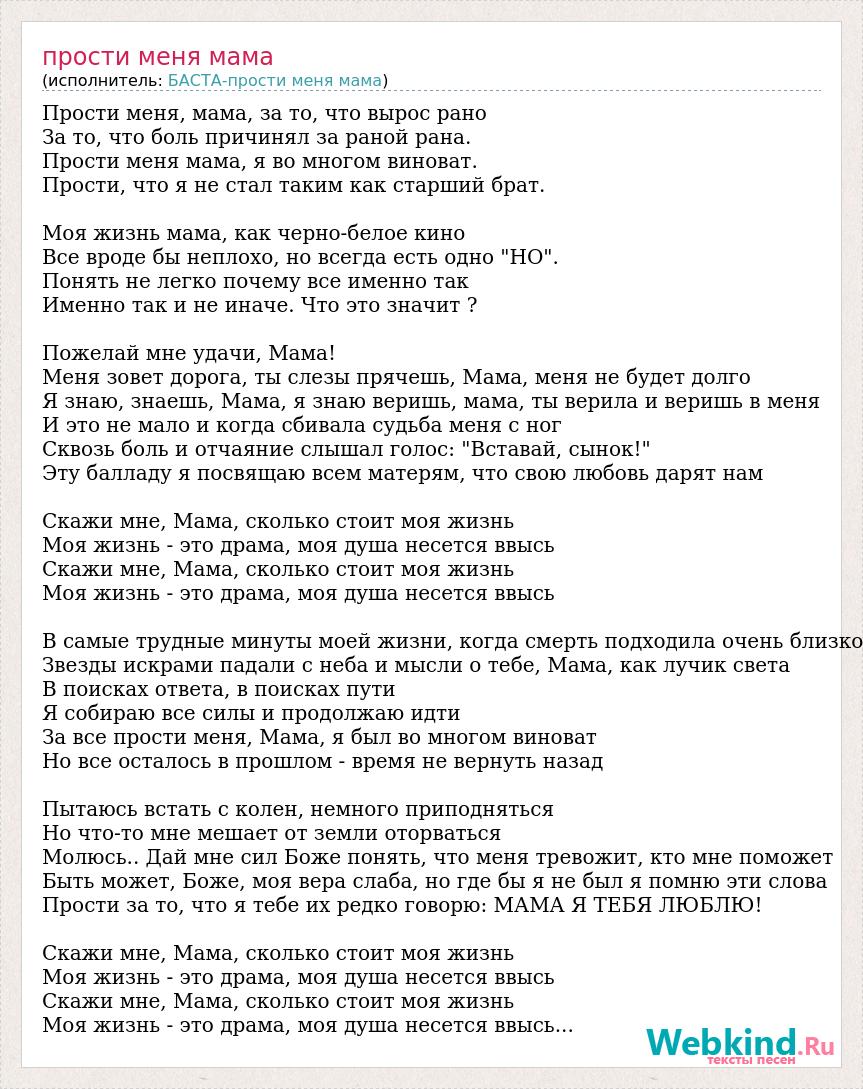Прости меня, мама, за то, что вырос рано За то, что боль причинял за раной рана. Прости меня мама, я во многом виноват. Прости, что я не стал таким как старший брат. Моя жизнь мама, как черно-белое кино Все вроде бы неплохо, но всегда есть одно "НО". Понять не легко почему все именно так Именно так и не иначе. Что это значит ? Пожелай мне удачи, Мама! Меня зовет дорога, ты слезы прячешь, Мама, меня не будет долго Я знаю, знаешь, Мама, я знаю веришь, мама, ты верила и веришь в меня И это не мало и когда сбивала судьба меня с ног Сквозь боль и отчаяние слышал голос: "Вставай, сынок!" Эту балладу я посвящаю всем матерям, что свою любовь дарят нам Скажи мне, Мама, сколько стоит моя жизнь Моя жизнь - это драма, моя душа несется ввысь Скажи мне, Мама, сколько стоит моя жизнь Моя жизнь - это драма, моя душа несется ввысь В самые трудные минуты моей жизни, когда смерть подходила очень близко Звезды искрами падали с неба и мысли о тебе, Мама, как лучик света В поисках ответа, в поисках пути Я собираю все силы и продолжаю идти За все прости меня, Мама, я был во многом виноват Но все осталось в прошлом - время не вернуть назад Пытаюсь встать с колен, немного приподняться Но что-то мне мешает от земли оторваться Молюсь.. Дай мне сил Боже понять, что меня тревожит, кто мне поможет Быть может, Боже, моя вера слаба, но где бы я не был я помню эти слова Прости за то, что я тебе их редко говорю: МАМА Я ТЕБЯ ЛЮБЛЮ! Скажи мне, Мама, сколько стоит моя жизнь Моя жизнь - это драма, моя душа несется ввысь Скажи мне, Мама, сколько стоит моя жизнь Моя жизнь - это драма, моя душа несется ввысь...