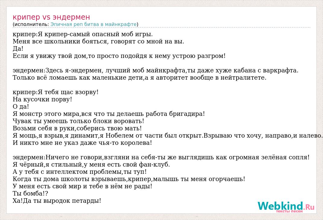крипер:Я крипер-самый опасный моб игры. Меня все школьники бояться, говорят со мной на вы. Да! Если я увижу твой дом,то просто подойдя к нему устрою разгром! эндермен:Здесь я-эндермен, лучший моб майнкрафта,ты даже хуже кабана с варкрафта. Только всё ломаешь как маленькие дети,а я авторитет вообще в нейтралитете. крипер:Я тебя щас взорву! На кусочки порву! О да! Я монстр этого мира,вся что ты делаешь работа бригадира! Чувак ты умеешь только блоки воровать! Возьми себя в руки,соберись твою мать! Я мощь,я взрыв,я динамит,я Нобелем от части был открыт.Взрываю что хочу, направо,и налево. И никто мне не указ даже чья-то королева! эндермен:Ничего не говори,взгляни на себя-ты же выглядишь как огромная зелёная сопля! Я чёрный,я стильный,у меня есть свой фан-клуб. А у тебя с интеллектом проблемы,ты туп! Когда ты дома школоты взрываешь,крипер,малышь ты меня огорчаешь! У меня есть свой мир и тебе в нём не рады! Ты бомба!? Ха!Да ты выродок петарды!