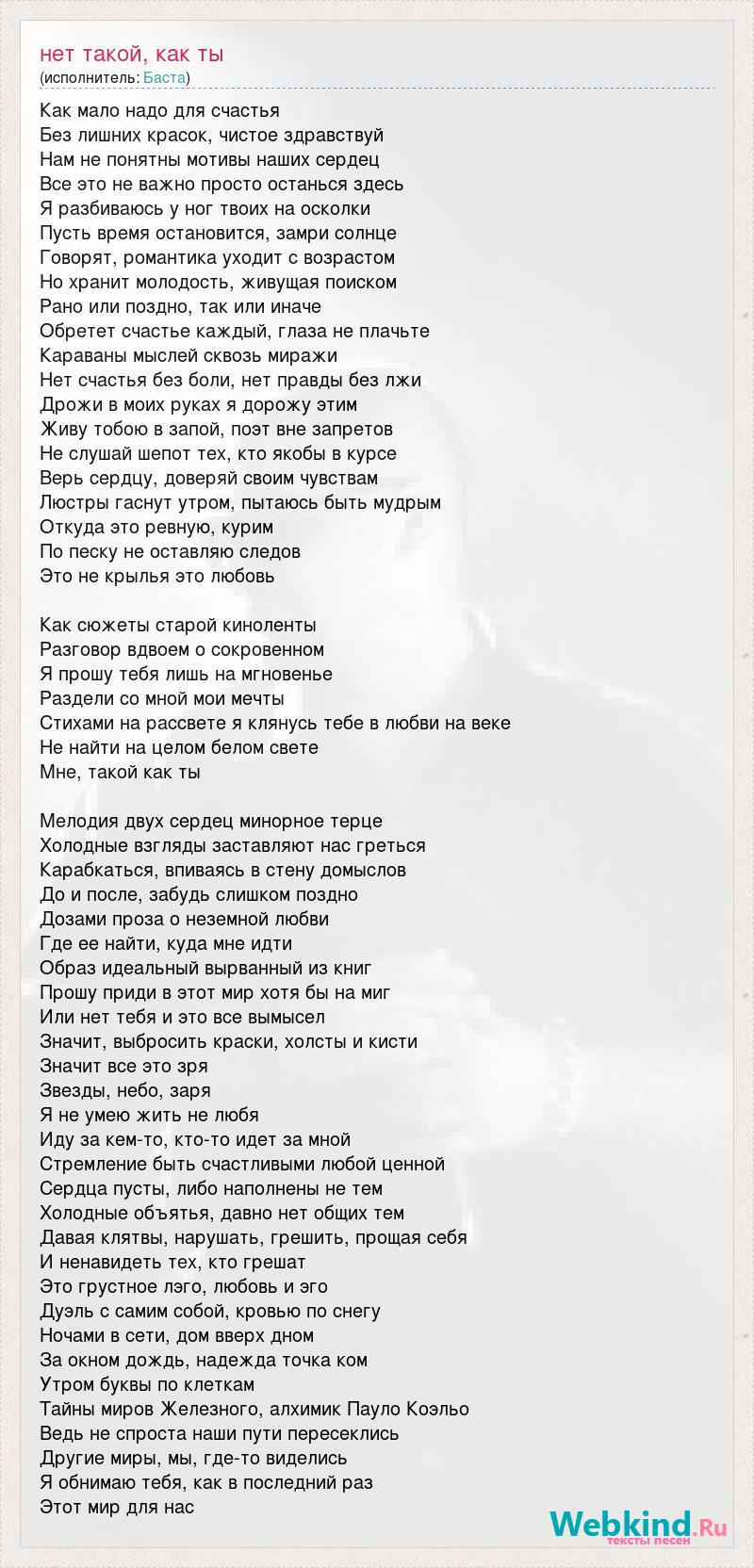 Как мало надо для счастья Без лишних красок, чистое здравствуй Нам не понятны мотивы наших сердец Все это не важно просто останься здесь Я разбиваюсь у ног твоих на осколки Пусть время остановится, замри солнце Говорят, романтика уходит с возрастом Но хранит молодость, живущая поиском Рано или поздно, так или иначе Обретет счастье каждый, глаза не плачьте Караваны мыслей сквозь миражи Нет счастья без боли, нет правды без лжи Дрожи в моих руках я дорожу этим Живу тобою в запой, поэт вне запретов Не слушай шепот тех, кто якобы в курсе Верь сердцу, доверяй своим чувствам Люстры гаснут утром, пытаюсь быть мудрым Откуда это ревную, курим По песку не оставляю следов Это не крылья это любовь Как сюжеты старой киноленты Разговор вдвоем о сокровенном Я прошу тебя лишь на мгновенье Раздели со мной мои мечты Стихами на рассвете я клянусь тебе в любви на веке Не найти на целом белом свете Мне, такой как ты Мелодия двух сердец минорное терце Холодные взгляды заставляют нас греться Карабкаться, впиваясь в стену домыслов До и после, забудь слишком поздно Дозами проза о неземной любви Где ее найти, куда мне идти Образ идеальный вырванный из книг Прошу приди в этот мир хотя бы на миг Или нет тебя и это все вымысел Значит, выбросить краски, холсты и кисти Значит все это зря Звезды, небо, заря Я не умею жить не любя Иду за кем-то, кто-то идет за мной Стремление быть счастливыми любой ценной Сердца пусты, либо наполнены не тем Холодные объятья, давно нет общих тем Давая клятвы, нарушать, грешить, прощая себя И ненавидеть тех, кто грешат Это грустное лэго, любовь и эго Дуэль с самим собой, кровью по снегу Ночами в сети, дом вверх дном За окном дождь, надежда точка ком Утром буквы по клеткам Тайны миров Железного, алхимик Пауло Коэльо Ведь не спроста наши пути пересеклись Другие миры, мы, где-то виделись Я обнимаю тебя, как в последний раз Этот мир для нас