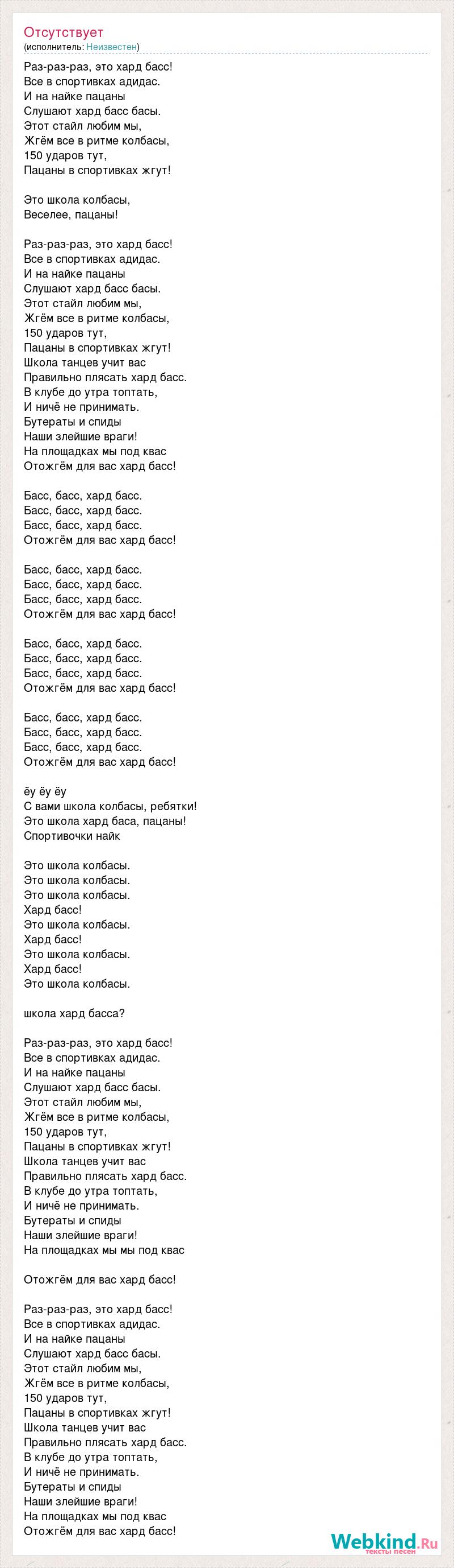 Раз-раз-раз, это хард басс! Все в спортивках адидас. И на найке пацаны Слушают хард басс басы. Этот стайл любим мы, Жгём все в ритме колбасы, 150 ударов тут, Пацаны в спортивках жгут! Это школа колбасы, Веселее, пацаны! Раз-раз-раз, это хард басс! Все в спортивках адидас. И на найке пацаны Слушают хард басс басы. Этот стайл любим мы, Жгём все в ритме колбасы, 150 ударов тут, Пацаны в спортивках жгут! Школа танцев учит вас Правильно плясать хард басс. В клубе до утра топтать, И ничё не принимать. Бутераты и спиды Наши злейшие враги! На площадках мы под квас Отожгём для вас хард басс! Басс, басс, хард басс. Басс, басс, хард басс. Басс, басс, хард басс. Отожгём для вас хард басс! Басс, басс, хард басс. Басс, басс, хард басс. Басс, басс, хард басс. Отожгём для вас хард басс! Басс, басс, хард басс. Басс, басс, хард басс. Басс, басс, хард басс. Отожгём для вас хард басс! Басс, басс, хард басс. Басс, басс, хард басс. Басс, басс, хард басс. Отожгём для вас хард басс! ёу ёу ёу С вами школа колбасы, ребятки! Это школа хард баса, пацаны! Спортивочки найк Это школа колбасы. Это школа колбасы. Это школа колбасы. Хард басс! Это школа колбасы. Хард басс! Это школа колбасы. Хард басс! Это школа колбасы. школа хард басса? Раз-раз-раз, это хард басс! Все в спортивках адидас. И на найке пацаны Слушают хард басс басы. Этот стайл любим мы, Жгём все в ритме колбасы, 150 ударов тут, Пацаны в спортивках жгут! Школа танцев учит вас Правильно плясать хард басс. В клубе до утра топтать, И ничё не принимать. Бутераты и спиды Наши злейшие враги! На площадках мы мы под квас Отожгём для вас хард басс! Раз-раз-раз, это хард басс! Все в спортивках адидас. И на найке пацаны Слушают хард басс басы. Этот стайл любим мы, Жгём все в ритме колбасы, 150 ударов тут, Пацаны в спортивках жгут! Школа танцев учит вас Правильно плясать хард басс. В клубе до утра топтать, И ничё не принимать. Бутераты и спиды Наши злейшие враги! На площадках мы под квас Отожгём для вас хард басс!