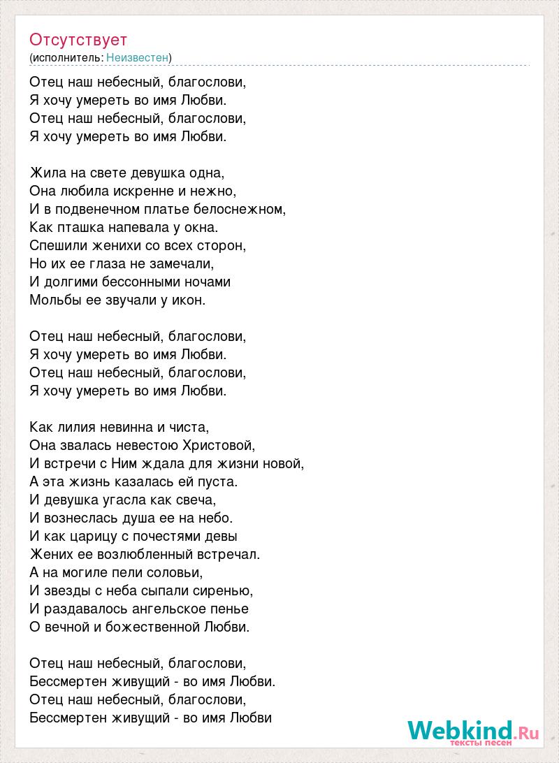 Отец наш небесный, благослови, Я хочу умереть во имя Любви. Отец наш небесный, благослови, Я хочу умереть во имя Любви. Жила на свете девушка одна, Она любила искренне и нежно, И в подвенечном платье белоснежном, Как пташка напевала у окна. Спешили женихи со всех сторон, Но их ее глаза не замечали, И долгими бессонными ночами Мольбы ее звучали у икон. Отец наш небесный, благослови, Я хочу умереть во имя Любви. Отец наш небесный, благослови, Я хочу умереть во имя Любви. Как лилия невинна и чиста, Она звалась невестою Христовой, И встречи с Ним ждала для жизни новой, А эта жизнь казалась ей пуста. И девушка угасла как свеча, И вознеслась душа ее на небо. И как царицу с почестями девы Жених ее возлюбленный встречал. А на могиле пели соловьи, И звезды с неба сыпали сиренью, И раздавалось ангельское пенье О вечной и божественной Любви. Отец наш небесный, благослови, Бессмертен живущий - во имя Любви. Отец наш небесный, благослови, Бессмертен живущий - во имя Любви