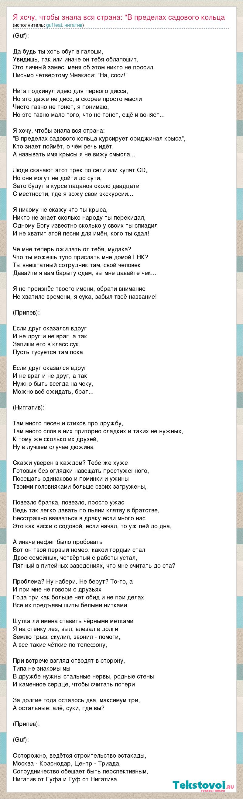 (Guf): Да будь ты хоть обут в галоши, Увидишь, так или иначе он тебя облапошит, Это личный замес, меня об этом никто не просил, Письмо четвёртому Ямакаси: "На, соси!" Нига подкинул идею для первого дисса, Но это даже не дисс, а скорее просто мысли Чисто гавно не тонет, я понимаю, Но это гавно мало того, что не тонет, ещё и воняет... Я хочу, чтобы знала вся страна: "В пределах садового кольца курсирует ориджинал крыса", Кто знает поймёт, о чём речь идёт, А называть имя крысы я не вижу смысла... Люди скачают этот трек по сети или купят CD, Но они могут не дойти до сути, Зато будут в курсе пацанов около двадцати С местности, где я вожу свои экскурсии... Я никому не скажу что ты крыса, Никто не знает сколько народу ты перекидал, Одному Богу известно сколько у своих ты спиздил И не хватит этой песни для имён, кого ты сдал! Чё мне теперь ожидать от тебя, мудака? Что ты можешь тупо прислать мне домой ГНК? Ты внештатный сотрудник там, свой человек Давайте я вам барыгу сдам, вы мне давайте чек... Я не произнёс твоего имени, обрати внимание Не хватило времени, я сука, забыл твоё название! (Припев): Если друг оказался вдруг И не друг и не враг, а так Запиши его в класс сук, Пусть тусуется там пока Если друг оказался вдруг И не враг и не друг, а так Нужно быть всегда на чеку, Можно всё ожидать, брат... (Ниггатив): Там много песен и стихов про дружбу, Там много слов в них приторно сладких и таких не нужных, К тому же сколько их друзей, Ну в лучшем случае дюжина Скажи уверен в каждом? Тебе же хуже Готовых без оглядки навещать простуженного, Посещать одинаково и поминки и ужины Твоими головняками больше своих загружены, Повезло братка, повезло, просто ужас Ведь так легко давать по пьяни клятву в братстве, Бесстрашно ввязаться в драку если много нас Это как виски с содовой, если начал, то уж пей до дна, А иначе нефиг было пробовать Вот он твой первый номер, какой гордый стал Двое семейных, четвёртый с работы устал, Пятный в питейных заведениях, что мне считать до ста? Проблема? Ну набери. Не берут? То-то, а И при мне не говори о друзьях Года три как больше нет обид и не при делах Все их предъявы шиты белыми нитками Шутка ли имена ставить чёрными метками Я на стенку лез, выл, влезал в долги Землю грыз, скулил, звонил - помоги, А все такие чёткие по телефону, При встрече взгляд отводят в сторону, Типа не знакомы мы В дружбе нужны стальные нервы, родные стены И каменное сердце, чтобы считать потери За долгие года осталось два, максимум три, А остальные: алё, суки, где вы? (Припев): (Guf): Осторожно, ведётся строительство эстакады, Москва - Краснодар, Центр - Триада, Сотрудничество обещает быть перспективным, Нигатив от Гуфа и Гуф от Нигатива