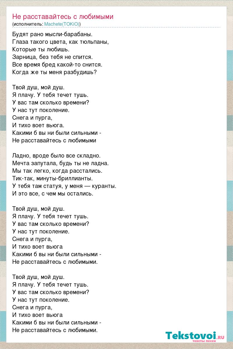 Будят рано мысли-барабаны. Глаза такого цвета, как тюльпаны, Которые ты любишь. Зарница, без тебя не спится. Все время бред какой-то снится. Когда же ты меня разбудишь? Твой душ, мой душ. Я плачу. У тебя течет тушь. У вас там сколько времени? У нас тут поколение. Снега и пурга, И тихо воет вьюга. Какими б вы ни были сильными - Не расставайтесь с любимыми Ладно, вроде было все складно. Мечта запутала, будь ты не ладна. Мы так легко, когда расстались. Тик-так, минуты-бриллианты. У тебя там статуя, у меня — куранты. И это все, с чем мы остались. Твой душ, мой душ. Я плачу. У тебя течет тушь. У вас там сколько времени? У нас тут поколение. Снега и пурга, И тихо воет вьюга Какими б вы ни были сильными - Не расставайтесь с любимыми. Твой душ, мой душ. Я плачу. У тебя течет тушь. У вас там сколько времени? У нас тут поколение. Снега и пурга, И тихо воет вьюга Какими б вы ни были сильными - Не расставайтесь с любимыми.