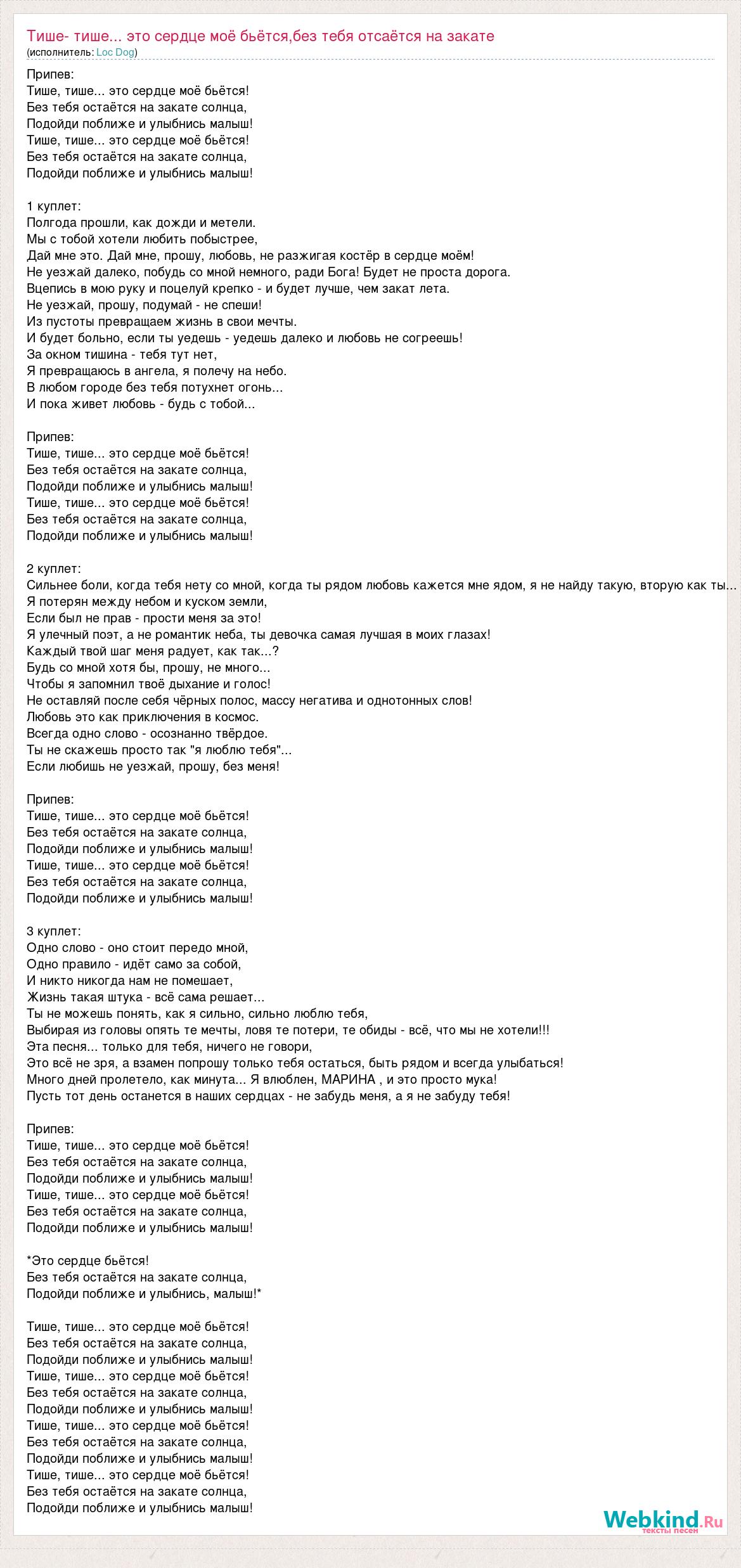 Припев: Тише, тише... это сердце моё бьётся! Без тебя остаётся на закате солнца, Подойди поближе и улыбнись малыш! Тише, тише... это сердце моё бьётся! Без тебя остаётся на закате солнца, Подойди поближе и улыбнись малыш! 1 куплет: Полгода прошли, как дожди и метели. Мы с тобой хотели любить побыстрее, Дай мне это. Дай мне, прошу, любовь, не разжигая костёр в сердце моём! Не уезжай далеко, побудь со мной немного, ради Бога! Будет не проста дорога. Вцепись в мою руку и поцелуй крепко - и будет лучше, чем закат лета. Не уезжай, прошу, подумай - не спеши! Из пустоты превращаем жизнь в свои мечты. И будет больно, если ты уедешь - уедешь далеко и любовь не согреешь! За окном тишина - тебя тут нет, Я превращаюсь в ангела, я полечу на небо. В любом городе без тебя потухнет огонь... И пока живет любовь - будь с тобой... Припев: Тише, тише... это сердце моё бьётся! Без тебя остаётся на закате солнца, Подойди поближе и улыбнись малыш! Тише, тише... это сердце моё бьётся! Без тебя остаётся на закате солнца, Подойди поближе и улыбнись малыш! 2 куплет: Сильнее боли, когда тебя нету со мной, когда ты рядом любовь кажется мне ядом, я не найду такую, вторую как ты... Я потерян между небом и куском земли, Если был не прав - прости меня за это! Я улечный поэт, а не романтик неба, ты девочка самая лучшая в моих глазах! Каждый твой шаг меня радует, как так...? Будь со мной хотя бы, прошу, не много... Чтобы я запомнил твоё дыхание и голос! Не оставляй после себя чёрных полос, массу негатива и однотонных слов! Любовь это как приключения в космос. Всегда одно слово - осознанно твёрдое. Ты не скажешь просто так "я люблю тебя"... Если любишь не уезжай, прошу, без меня! Припев: Тише, тише... это сердце моё бьётся! Без тебя остаётся на закате солнца, Подойди поближе и улыбнись малыш! Тише, тише... это сердце моё бьётся! Без тебя остаётся на закате солнца, Подойди поближе и улыбнись малыш! 3 куплет: Одно слово - оно стоит передо мной, Одно правило - идёт само за собой, И никто никогда нам не помешает, Жизнь такая штука - всё сама решает... Ты не можешь понять, как я сильно, сильно люблю тебя, Выбирая из головы опять те мечты, ловя те потери, те обиды - всё, что мы не хотели!!! Эта песня... только для тебя, ничего не говори, Это всё не зря, а взамен попрошу только тебя остаться, быть рядом и всегда улыбаться! Много дней пролетело, как минута... Я влюблен, МАРИНА , и это просто мука! Пусть тот день останется в наших сердцах - не забудь меня, а я не забуду тебя! Припев: Тише, тише... это сердце моё бьётся! Без тебя остаётся на закате солнца, Подойди поближе и улыбнись малыш! Тише, тише... это сердце моё бьётся! Без тебя остаётся на закате солнца, Подойди поближе и улыбнись малыш! *Это сердце бьётся! Без тебя остаётся на закате солнца, Подойди поближе и улыбнись, малыш!* Тише, тише... это сердце моё бьётся! Без тебя остаётся на закате солнца, Подойди поближе и улыбнись малыш! Тише, тише... это сердце моё бьётся! Без тебя остаётся на закате солнца, Подойди поближе и улыбнись малыш! Тише, тише... это сердце моё бьётся! Без тебя остаётся на закате солнца, Подойди поближе и улыбнись малыш! Тише, тише... это сердце моё бьётся! Без тебя остаётся на закате солнца, Подойди поближе и улыбнись малыш!