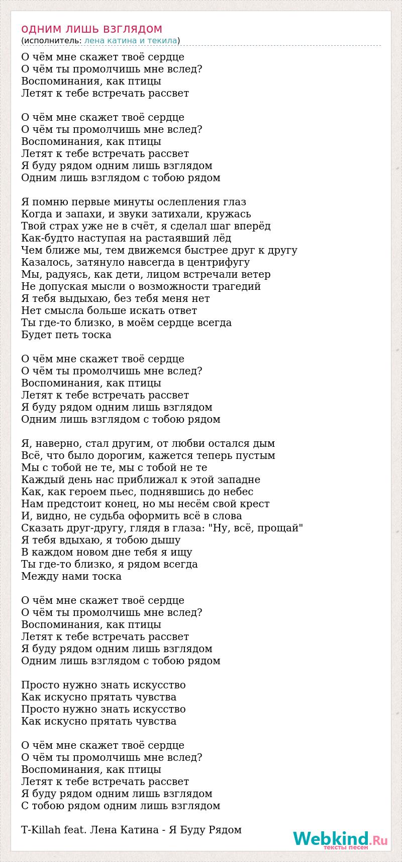 О чём мне скажет твоё сердце О чём ты промолчишь мне вслед? Воспоминания, как птицы Летят к тебе встречать рассвет О чём мне скажет твоё сердце О чём ты промолчишь мне вслед? Воспоминания, как птицы Летят к тебе встречать рассвет Я буду рядом одним лишь взглядом Одним лишь взглядом с тобою рядом Я помню первые минуты ослепления глаз Когда и запахи, и звуки затихали, кружась Твой страх уже не в счёт, я сделал шаг вперёд Как-будто наступая на растаявший лёд Чем ближе мы, тем движемся быстрее друг к другу Казалось, затянуло навсегда в центрифугу Мы, радуясь, как дети, лицом встречали ветер Не допуская мысли о возможности трагедий Я тебя выдыхаю, без тебя меня нет Нет смысла больше искать ответ Ты где-то близко, в моём сердце всегда Будет петь тоска О чём мне скажет твоё сердце О чём ты промолчишь мне вслед? Воспоминания, как птицы Летят к тебе встречать рассвет Я буду рядом одним лишь взглядом Одним лишь взглядом с тобою рядом Я, наверно, стал другим, от любви остался дым Всё, что было дорогим, кажется теперь пустым Мы с тобой не те, мы с тобой не те Каждый день нас приближал к этой западне Как, как героем пьес, поднявшись до небес Нам предстоит конец, но мы несём свой крест И, видно, не судьба оформить всё в слова Сказать друг-другу, глядя в глаза: "Ну, всё, прощай" Я тебя вдыхаю, я тобою дышу В каждом новом дне тебя я ищу Ты где-то близко, я рядом всегда Между нами тоска О чём мне скажет твоё сердце О чём ты промолчишь мне вслед? Воспоминания, как птицы Летят к тебе встречать рассвет Я буду рядом одним лишь взглядом Одним лишь взглядом с тобою рядом Просто нужно знать искусство Как искусно прятать чувства Просто нужно знать искусство Как искусно прятать чувства О чём мне скажет твоё сердце О чём ты промолчишь мне вслед? Воспоминания, как птицы Летят к тебе встречать рассвет Я буду рядом одним лишь взглядом С тобою рядом одним лишь взглядом T-Killah feat. Лена Катина - Я Буду Рядом