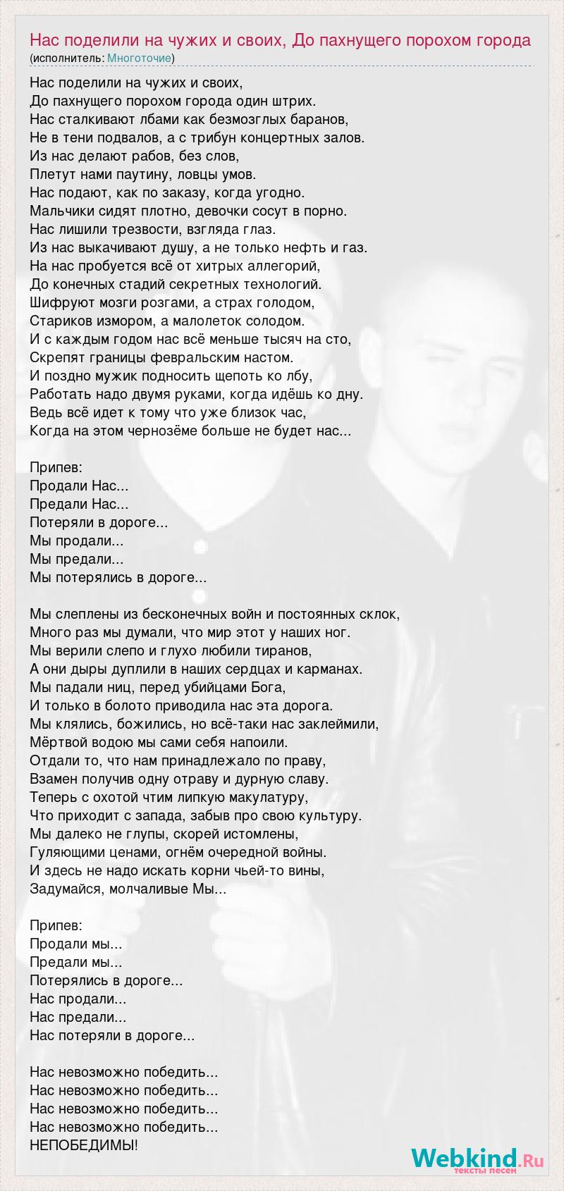 Нас поделили на чужих и своих, До пахнущего порохом города один штрих. Нас сталкивают лбами как безмозглых баранов, Не в тени подвалов, а с трибун концертных залов. Из нас делают рабов, без слов, Плетут нами паутину, ловцы умов. Нас подают, как по заказу, когда угодно. Мальчики сидят плотно, девочки сосут в порно. Нас лишили трезвости, взгляда глаз. Из нас выкачивают душу, а не только нефть и газ. На нас пробуется всё от хитрых аллегорий, До конечных стадий секретных технологий. Шифруют мозги розгами, а страх голодом, Стариков измором, а малолеток солодом. И с каждым годом нас всё меньше тысяч на сто, Скрепят границы февральским настом. И поздно мужик подносить щепоть ко лбу, Работать надо двумя руками, когда идёшь ко дну. Ведь всё идет к тому что уже близок час, Когда на этом чернозёме больше не будет нас... Припев: Продали Нас... Предали Нас... Потеряли в дороге... Мы продали... Мы предали... Мы потерялись в дороге... Мы слеплены из бесконечных войн и постоянных склок, Много раз мы думали, что мир этот у наших ног. Мы верили слепо и глухо любили тиранов, А они дыры дуплили в наших сердцах и карманах. Мы падали ниц, перед убийцами Бога, И только в болото приводила нас эта дорога. Мы клялись, божились, но всё-таки нас заклеймили, Мёртвой водою мы сами себя напоили. Отдали то, что нам принадлежало по праву, Взамен получив одну отраву и дурную славу. Теперь с охотой чтим липкую макулатуру, Что приходит с запада, забыв про свою культуру. Мы далеко не глупы, скорей истомлены, Гуляющими ценами, огнём очередной войны. И здесь не надо искать корни чьей-то вины, Задумайся, молчаливые Мы... Припев: Продали мы... Предали мы... Потерялись в дороге... Нас продали... Нас предали... Нас потеряли в дороге... Нас невозможно победить... Нас невозможно победить... Нас невозможно победить... Нас невозможно победить... НЕПОБЕДИМЫ!