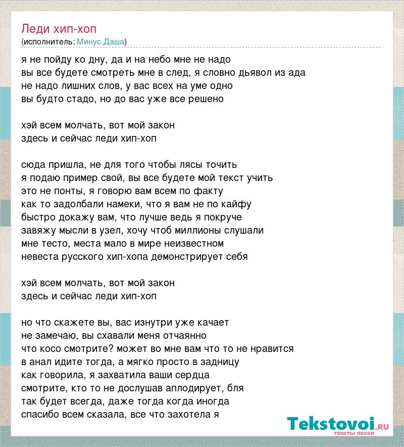 я не пойду ко дну, да и на небо мне не надо вы все будете смотреть мне в след, я словно дьявол из ада не надо лишних слов, у вас всех на уме одно вы будто стадо, но до вас уже все решено хэй всем молчать, вот мой закон здесь и сейчас леди хип-хоп сюда пришла, не для того чтобы лясы точить я подаю пример свой, вы все будете мой текст учить это не понты, я говорю вам всем по факту как то задолбали намеки, что я вам не по кайфу быстро докажу вам, что лучше ведь я покруче завяжу мысли в узел, хочу чтоб миллионы слушали мне тесто, места мало в мире неизвестном невеста русского хип-хопа демонстрирует себя хэй всем молчать, вот мой закон здесь и сейчас леди хип-хоп но что скажете вы, вас изнутри уже качает не замечаю, вы схавали меня отчаянно что косо смотрите? может во мне вам что то не нравится в анал идите тогда, а мягко просто в задницу как говорила, я захватила ваши сердца смотрите, кто то не дослушав аплодирует, бля так будет всегда, даже тогда когда иногда спасибо всем сказала, все что захотела я