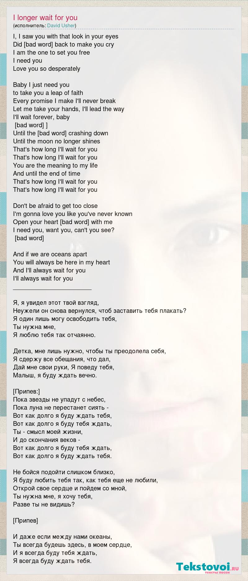 I, I saw you with that look in your eyes Did he come back to make you cry I am the one to set you free I need you Love you so desperately Baby I just need you to take you a leap of faith Every promise I make I'll never break Let me take your hands, I'll lead the way I'll wait forever, baby [Chorus:] Until the stars come crashing down Until the moon no longer shines That's how long I'll wait for you That's how long I'll wait for you You are the meaning to my life And until the end of time That's how long I'll wait for you That's how long I'll wait for you Don't be afraid to get toо close I'm gonna love you like you've never known Open your heart and come with me I need you, want you, can't you see? [Chorus] And if we are oceans apart You will always be here in my heart And I'll always wait for you I'll always wait for you _______________________ Я, я увидел этот твой взгляд, Неужели он снова вернулся, чтоб заставить тебя плакать? Я один лишь могу освободить тебя, Ты нужна мне, Я люблю тебя так отчаянно. Детка, мне лишь нужно, чтобы ты преодолела себя, Я сдержу все обещания, что дал, Дай мне свои руки, Я поведу тебя, Малыш, я буду ждать вечно. [Припев:] Пока звезды не упадут с небес, Пока луна не перестанет сиять - Вот как долго я буду ждать тебя, Вот как долго я буду тебя ждать, Ты - смысл моей жизни, И до скончания веков - Вот как долго я буду тебя ждать, Вот как долго я буду ждать тебя. Не бойся подойти слишком близко, Я буду любить тебя так, как тебя еще не любили, Открой свое сердце и пойдем со мной, Ты нужна мне, я хочу тебя, Разве ты не видишь? [Припев] И даже если между нами океаны, Ты всегда будешь здесь, в моем сердце, И я всегда буду тебя ждать, Я всегда буду ждать тебя.