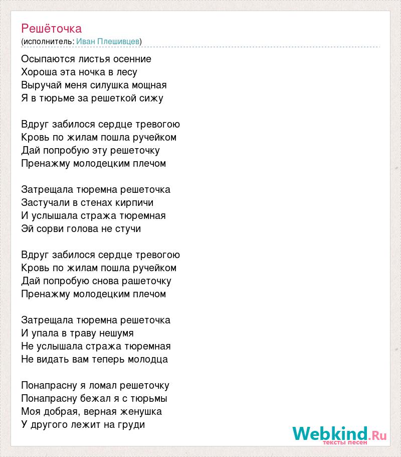 Осыпаются листья осенние Хороша эта ночка в лесу Выручай меня силушка мощная Я в тюрьме за решеткой сижу Вдруг забилося сердце тревогою Кровь по жилам пошла ручейком Дай попробую эту решеточку Пренажму молодецким плечом Затрещала тюремна решеточка Застучали в стенах кирпичи И услышала стража тюремная Эй сорви голова не стучи Вдруг забилося сердце тревогою Кровь по жилам пошла ручейком Дай попробую снова рашеточку Пренажму молодецким плечом Затрещала тюремна решеточка И упала в траву нешумя Не услышала стража тюремная Не видать вам теперь молодца Понапрасну я ломал решеточку Понапрасну бежал я с тюрьмы Моя добрая, верная женушка У другого лежит на груди
