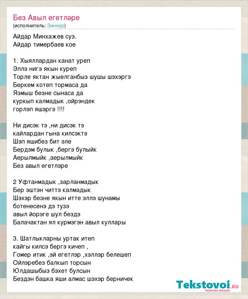 Айдар Минхажев суз. Айдар тимербаев кое 1. Хыяллардан канат уреп Эллэ нигэ якын куреп Торле яктан жыелганбыз шушы шэхэргэ Беркем котеп тормаса да Язмыш безне сынаса да куркып калмадык ,ойрэндек горлэп яшэргэ !!!! Ни дисэк тэ ,ни дисэк тэ кайлардан гына килсэктэ Шэп яшибез бит эле Бердэм булык ,бергэ булыйк Аерылмыйк ,аерылмыйк Без авыл егетлэре 2 Уфтанмадык ,зарланмадык Бер эштэн читтэ калмадык Шэхэр безне якын итте эллэ шунамы ботенесенэ дэ тузэ авыл йорэге шул бездэ Балачактан ял курмэгэн авыл куллары 3. Шатлыкларны уртак итеп кайгы килсэ бергэ кичеп , Гомер итик ,эй егетлэр ,хэллэр белешеп Ойлэребез балкып торсын Юлдашыбыз бэхет булсын Бездэн башка яши алмас шэхэр берничек