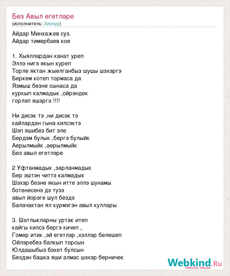 Айдар Минхажев суз. Айдар тимербаев кое 1. Хыяллардан канат уреп Эллэ нигэ якын куреп Торле яктан жыелганбыз шушы шэхэргэ Беркем котеп тормаса да Язмыш безне сынаса да куркып калмадык ,ойрэндек горлэп яшэргэ !!!! Ни дисэк тэ ,ни дисэк тэ кайлардан гына килсэктэ Шэп яшибез бит эле Бердэм булык ,бергэ булыйк Аерылмыйк ,аерылмыйк Без авыл егетлэре 2 Уфтанмадык ,зарланмадык Бер эштэн читтэ калмадык Шэхэр безне якын итте эллэ шунамы ботенесенэ дэ тузэ авыл йорэге шул бездэ Балачактан ял курмэгэн авыл куллары 3. Шатлыкларны уртак итеп кайгы килсэ бергэ кичеп , Гомер итик ,эй егетлэр ,хэллэр белешеп Ойлэребез балкып торсын Юлдашыбыз бэхет булсын Бездэн башка яши алмас шэхэр берничек