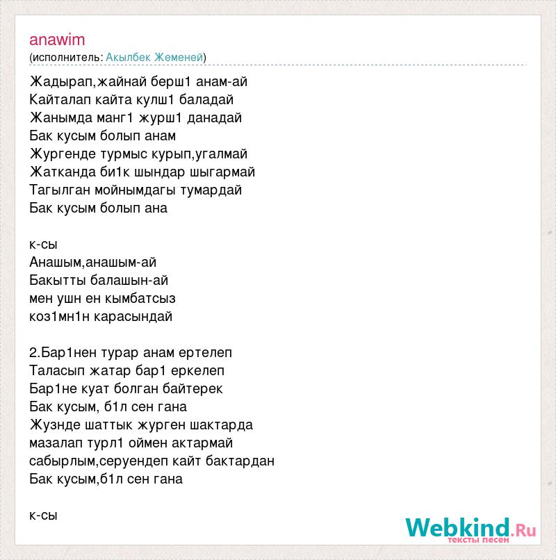 Жадырап,жайнай берш1 анам-ай Кайталап кайта кулш1 баладай Жанымда манг1 журш1 данадай Бак кусым болып анам Жургенде турмыс курып,угалмай Жатканда би1к шындар шыгармай Тагылган мойнымдагы тумардай Бак кусым болып ана к-сы Анашым,анашым-ай Бакытты балашын-ай мен ушн ен кымбатсыз коз1мн1н карасындай 2.Бар1нен турар анам ертелеп Таласып жатар бар1 еркелеп Бар1не куат болган байтерек Бак кусым, б1л сен гана Жузнде шаттык журген шактарда мазалап турл1 оймен актармай сабырлым,серуендеп кайт бактардан Бак кусым,б1л сен гана к-сы