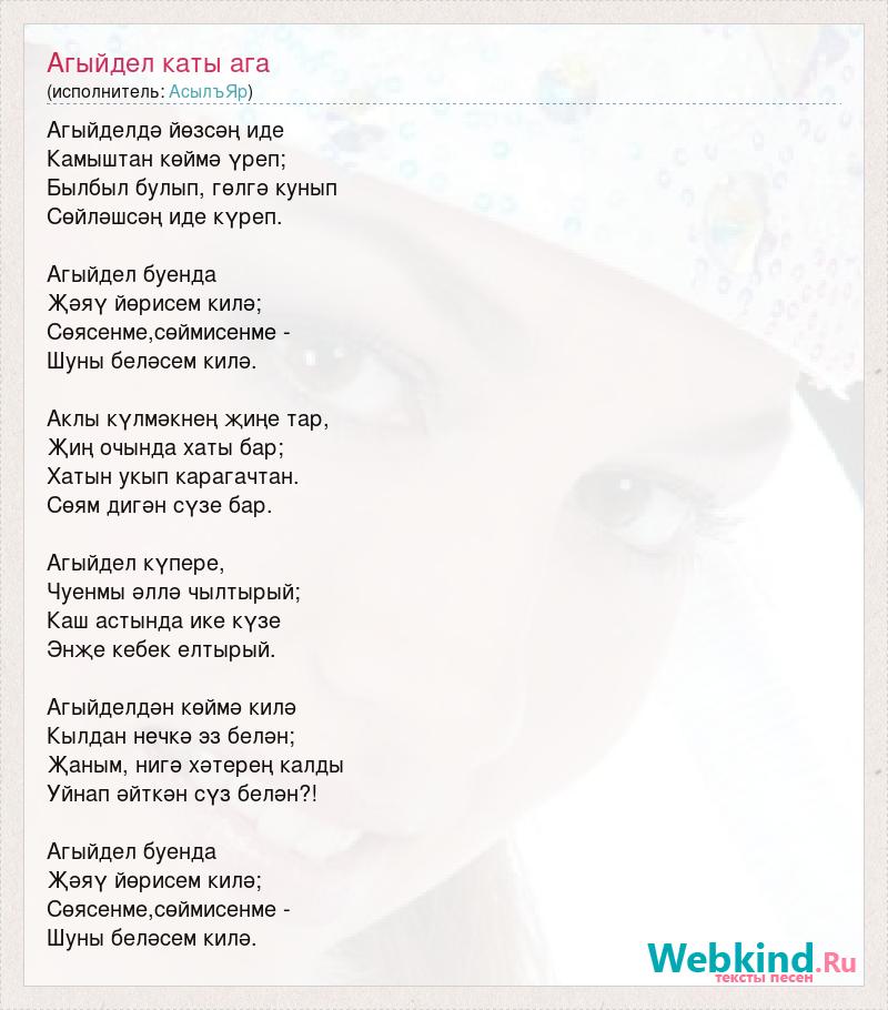 Агыйделдә йөзсәң иде Камыштан көймә үреп; Былбыл булып, гөлгә кунып Сөйләшсәң иде күреп. Агыйдел буенда Җәяү йөрисем килә; Сөясенме,сөймисенме - Шуны беләсем килә. Аклы күлмәкнең җиңе тар, Җиң очында хаты бар; Хатын укып карагачтан. Сөям дигән сүзе бар. Агыйдел күпере, Чуенмы әллә чылтырый; Каш астында ике күзе Энҗе кебек елтырый. Агыйделдән көймә килә Кылдан нечкә эз белән; Җаным, нигә хәтерең калды Уйнап әйткән сүз белән?! Агыйдел буенда Җәяү йөрисем килә; Сөясенме,сөймисенме - Шуны беләсем килә.