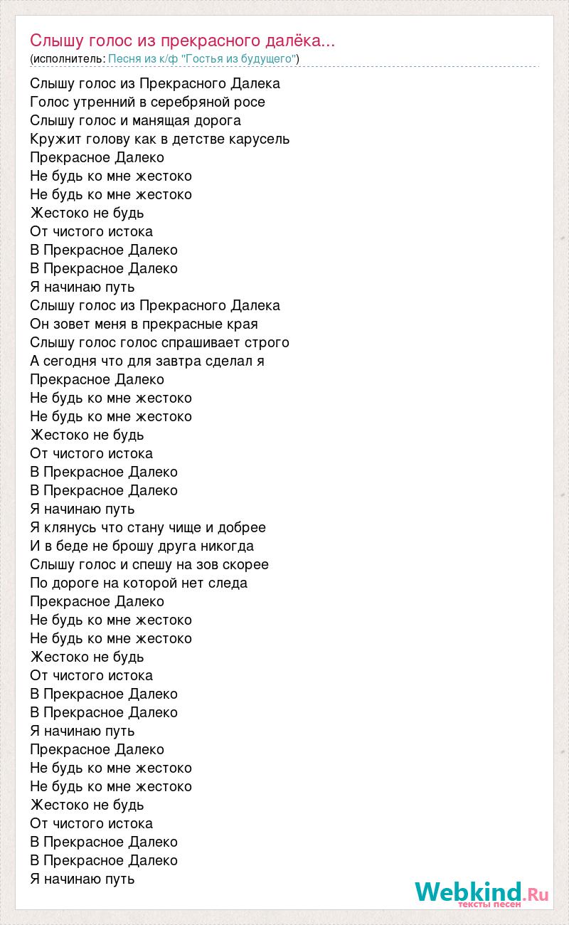 Слышу голос из Прекрасного Далека Голос утренний в серебряной росе Слышу голос и манящая дорога Кружит голову как в детстве карусель Прекрасное Далеко Не будь ко мне жестоко Не будь ко мне жестоко Жестоко не будь От чистого истока В Прекрасное Далеко В Прекрасное Далеко Я начинаю путь Слышу голос из Прекрасного Далека Он зовет меня в прекрасные края Слышу голос голос спрашивает строго А сегодня что для завтра сделал я Прекрасное Далеко Не будь ко мне жестоко Не будь ко мне жестоко Жестоко не будь От чистого истока В Прекрасное Далеко В Прекрасное Далеко Я начинаю путь Я клянусь что стану чище и добрее И в беде не брошу друга никогда Слышу голос и спешу на зов скорее По дороге на которой нет следа Прекрасное Далеко Не будь ко мне жестоко Не будь ко мне жестоко Жестоко не будь От чистого истока В Прекрасное Далеко В Прекрасное Далеко Я начинаю путь Прекрасное Далеко Не будь ко мне жестоко Не будь ко мне жестоко Жестоко не будь От чистого истока В Прекрасное Далеко В Прекрасное Далеко Я начинаю путь