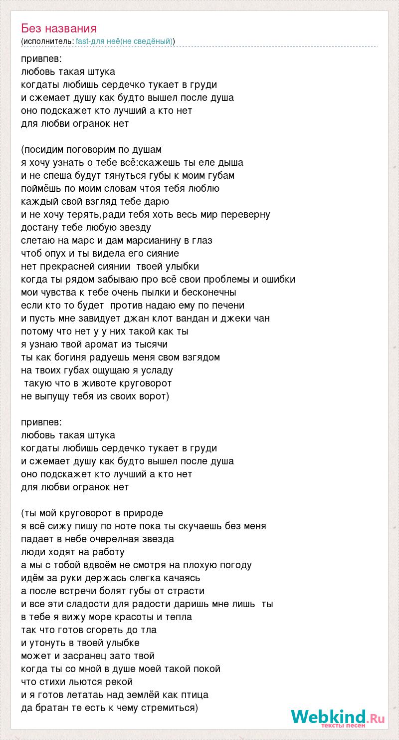 привпев: любовь такая штука когдаты любишь сердечко тукает в груди и сжемает душу как будто вышел после душа оно подскажет кто лучший а кто нет для любви огранок нет (посидим поговорим по душам я хочу узнать о тебе всё:скажешь ты еле дыша и не спеша будут тянуться губы к моим губам поймёшь по моим словам чтоя тебя люблю каждый свой взгляд тебе дарю и не хочу терять,ради тебя хоть весь мир переверну достану тебе любую звезду слетаю на марс и дам марсианину в глаз чтоб опух и ты видела его сияние нет прекрасней сиянии твоей улыбки когда ты рядом забываю про всё свои проблемы и ошибки мои чувства к тебе очень пылки и бесконечны если кто то будет против надаю ему по печени и пусть мне завидует джан клот вандан и джеки чан потому что нет у у них такой как ты я узнаю твой аромат из тысячи ты как богиня радуешь меня свом взгядом на твоих губах ощущаю я усладу такую что в животе круговорот не выпущу тебя из своих ворот) привпев: любовь такая штука когдаты любишь сердечко тукает в груди и сжемает душу как будто вышел после душа оно подскажет кто лучший а кто нет для любви огранок нет (ты мой круговорот в природе я всё сижу пишу по ноте пока ты скучаешь без меня падает в небе очерелная звезда люди ходят на работу а мы с тобой вдвоём не смотря на плохую погоду идём за руки держась слегка качаясь а после встречи болят губы от страсти и все эти сладости для радости даришь мне лишь ты в тебе я вижу море красоты и тепла так что готов сгореть до тла и утонуть в твоей улыбке может и засранец зато твой когда ты со мной в душе моей такой покой что стихи льются рекой и я готов летатаь над землёй как птица да братан те есть к чему стремиться)