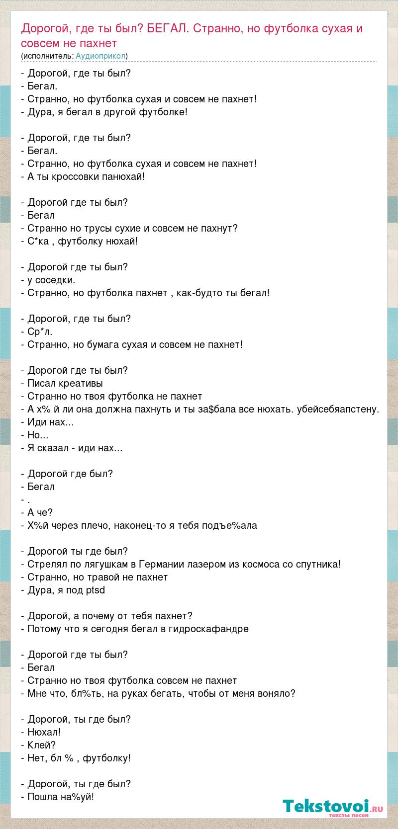 Главная→Исполнители→Аудиоприкол→Дорогой, где ты был? БЕГАЛ. Странно, но футболка сухая и совсем не пахнет