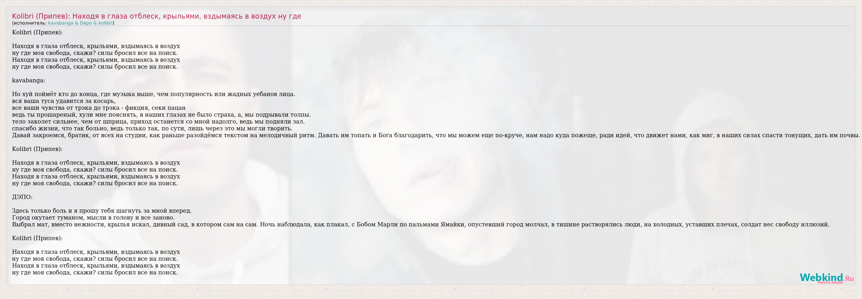 Kolibri (Припев): Находя в глаза отблеск, крыльями, вздымаясь в воздух ну где моя свобода, скажи? силы бросил все на поиск. Находя в глаза отблеск, крыльями, вздымаясь в воздух ну где моя свобода, скажи? силы бросил все на поиск. kavabanga: Но хуй поймёт кто до конца, где музыка выше, чем популярность или жадных уебанов лица. вся ваша туса удавится за косарь, все ваши чувства от трэка до трэка - фикция, секи пацан ведь ты прошареный, хули мне пояснять, в наших глазах не было страха, а, мы подрывали толпы. тело заколет сильнее, чем от шприца, приход останется со мной надолго, ведь мы подняли зал. спасибо жизни, что так больно, ведь только так, по сути, лишь через это мы могли творить. Давай закроемся, братик, от всех на студии, как раньше разойдёмся текстом на мелодичный ритм. Давать им топать и Бога благодарить, что мы можем еще по-круче, нам надо куда пожеще, ради идей, что движет нами, как миг, в наших силах спасти тонущих, дать им почвы. Kolibri (Припев): Находя в глаза отблеск, крыльями, вздымаясь в воздух ну где моя свобода, скажи? силы бросил все на поиск. Находя в глаза отблеск, крыльями, вздымаясь в воздух ну где моя свобода, скажи? силы бросил все на поиск. ДЭПО: Здесь только боль и я прошу тебя шагнуть за мной вперед. Город окутает туманом, мысли в голову и все заново. Выбрал мат, вместо нежности, крылья искал, дивный сад, в котором сам на сам. Ночь наблюдала, как плакал, с Бобом Марли по пальмами Ямайки, опустевший город молчал, в тишине растворялись люди, на холодных, уставших плечах, солдат нес свободу иллюзий. Kolibri (Припев): Находя в глаза отблеск, крыльями, вздымаясь в воздух ну где моя свобода, скажи? силы бросил все на поиск. Находя в глаза отблеск, крыльями, вздымаясь в воздух ну где моя свобода, скажи? силы бросил все на поиск.