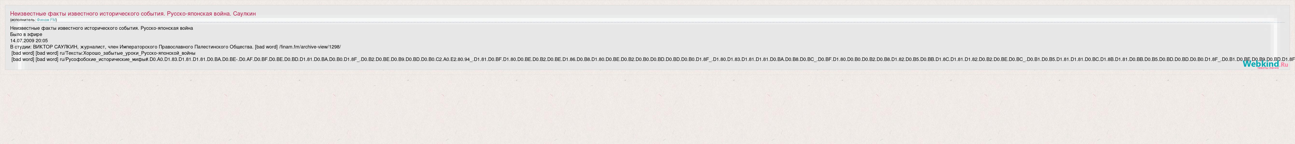 Неизвестные факты известного исторического события. Русско-японская война Было в эфире 14.07.2009 20:05 В студии: ВИКТОР САУЛКИН, журналист, член Императорского Православного Палестинского Общества. [bad word] /finam.fm/archive-view/1298/ [bad word] [bad word] ru/Тексты:Хорошо_забытые_уроки_Русско-японской_войны [bad word] [bad word] ru/Русофобские_исторические_мифы#.D0.A0.D1.83.D1.81.D1.81.D0.BA.D0.BE-.D0.AF.D0.BF.D0.BE.D0.BD.D1.81.D0.BA.D0.B0.D1.8F_.D0.B2.D0.BE.D0.B9.D0.BD.D0.B0.C2.A0.E2.80.94_.D1.81.D0.BF.D1.80.D0.BE.D0.B2.D0.BE.D1.86.D0.B8.D1.80.D0.BE.D0.B2.D0.B0.D0.BD.D0.BD.D0.B0.D1.8F_.D1.80.D1.83.D1.81.D1.81.D0.BA.D0.B8.D0.BC_.D0.BF.D1.80.D0.B0.D0.B2.D0.B8.D1.82.D0.B5.D0.BB.D1.8C.D1.81.D1.82.D0.B2.D0.BE.D0.BC_.D0.B1.D0.B5.D1.81.D1.81.D0.BC.D1.8B.D1.81.D0.BB.D0.B5.D0.BD.D0.BD.D0.B0.D1.8F_.D0.B1.D0.BE.D0.B9.D0.BD.D1.8F