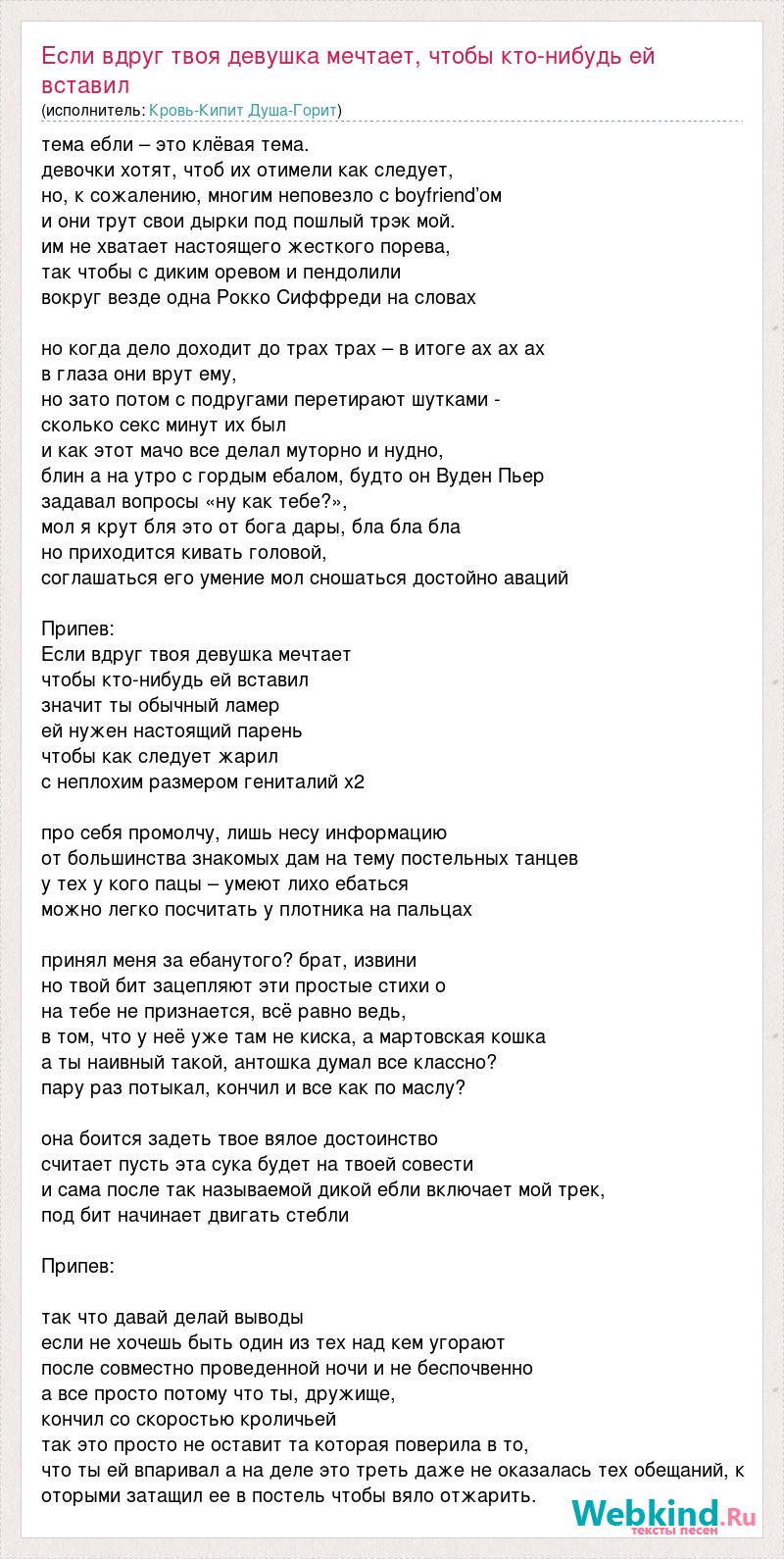 тема ебли – это клёвая тема. девочки хотят, чтоб их отимели как следует, но, к сожалению, многим неповезло с boyfriend’ом и они трут свои дырки под пошлый трэк мой. им не хватает настоящего жесткого порева, так чтобы с диким оревом и пендолили вокруг везде одна Рокко Сиффреди на словах но когда дело доходит до трах трах – в итоге ах ах ах в глаза они врут ему, но зато потом с подругами перетирают шутками - сколько секс минут их был и как этот мачо все делал муторно и нудно, блин а на утро с гордым ебалом, будто он Вуден Пьер задавал вопросы «ну как тебе?», мол я крут бля это от бога дары, бла бла бла но приходится кивать головой, соглашаться его умение мол сношаться достойно аваций Припев: Если вдруг твоя девушка мечтает чтобы кто-нибудь ей вставил значит ты обычный ламер ей нужен настоящий парень чтобы как следует жарил с неплохим размером гениталий х2 про себя промолчу, лишь несу информацию от большинства знакомых дам на тему постельных танцев у тех у кого пацы – умеют лихо ебаться можно легко посчитать у плотника на пальцах принял меня за ебанутого? брат, извини но твой бит зацепляют эти простые стихи о на тебе не признается, всё равно ведь, в том, что у неё уже там не киска, а мартовская кошка а ты наивный такой, антошка думал все классно? пару раз потыкал, кончил и все как по маслу? она боится задеть твое вялое достоинство считает пусть эта сука будет на твоей совести и сама после так называемой дикой ебли включает мой трек, под бит начинает двигать стебли Припев: так что давай делай выводы если не хочешь быть один из тех над кем угорают после совместно проведенной ночи и не беспочвенно а все просто потому что ты, дружище, кончил со скоростью кроличьей так это просто не оставит та которая поверила в то, что ты ей впаривал а на деле это треть даже не оказалась тех обещаний, к оторыми затащил ее в постель чтобы вяло отжарить.