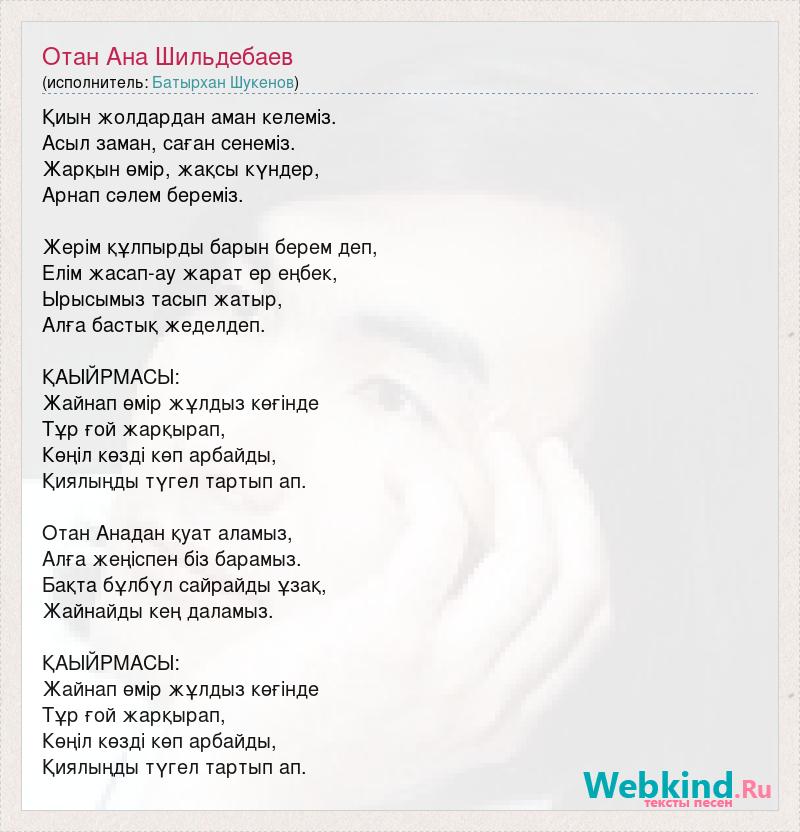 Қиын жолдардан аман келеміз. Асыл заман, саған сенеміз. Жарқын өмір, жақсы күндер, Арнап сәлем береміз. Жерім құлпырды барын берем деп, Елім жасап-ау жарат ер еңбек, Ырысымыз тасып жатыр, Алға бастық жеделдеп. ҚАЫЙРМАСЫ: Жайнап өмір жұлдыз көғінде Тұр ғой жарқырап, Көңіл көзді көп арбайды, Қиялыңды түгел тартып ап. Отан Анадан қуат аламыз, Алға жеңіспен біз барамыз. Бақта бұлбүл сайрайды ұзақ, Жайнайды кең даламыз. ҚАЫЙРМАСЫ: Жайнап өмір жұлдыз көғінде Тұр ғой жарқырап, Көңіл көзді көп арбайды, Қиялыңды түгел тартып ап.
