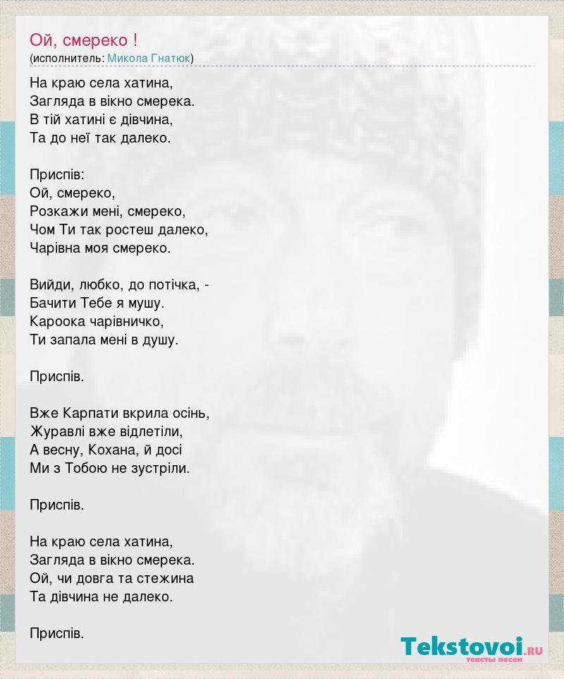 На краю села хатина, Загляда в вікно смерека. В тій хатині є дівчина, Та до неї так далеко. Приспів: Ой, смереко, Розкажи мені, смереко, Чом Ти так ростеш далеко, Чарівна моя смереко. Вийди, любко, до потічка, - Бачити Тебе я мушу. Кароока чарівничко, Ти запала мені в душу. Приспів. Вже Карпати вкрила осінь, Журавлі вже відлетіли, А весну, Кохана, й досі Ми з Тобою не зустріли. Приспів. На краю села хатина, Загляда в вікно смерека. Ой, чи довга та стежина Та дівчина не далеко. Приспів.