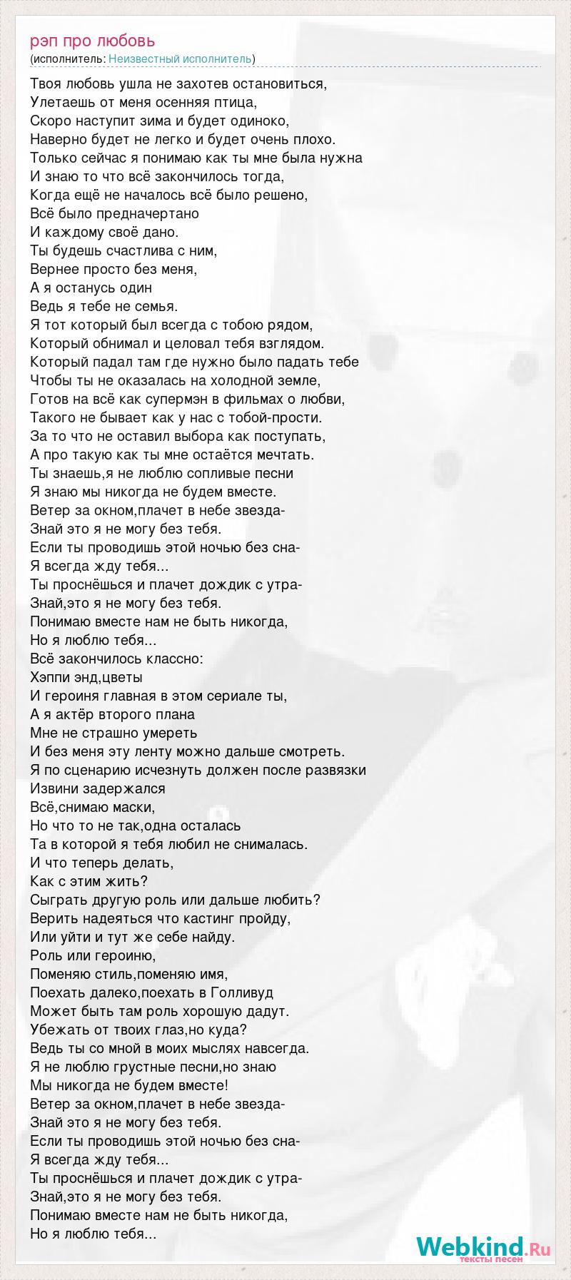 Твоя любовь ушла не захотев остановиться, Улетаешь от меня осенняя птица, Скоро наступит зима и будет одиноко, Наверно будет не легко и будет очень плохо. Только сейчас я понимаю как ты мне была нужна И знаю то что всё закончилось тогда, Когда ещё не началось всё было решено, Всё было предначертано И каждому своё дано. Ты будешь счастлива с ним, Вернее просто без меня, А я останусь один Ведь я тебе не семья. Я тот который был всегда с тобою рядом, Который обнимал и целовал тебя взглядом. Который падал там где нужно было падать тебе Чтобы ты не оказалась на холодной земле, Готов на всё как супермэн в фильмах о любви, Такого не бывает как у нас с тобой-прости. За то что не оставил выбора как поступать, А про такую как ты мне остаётся мечтать. Ты знаешь,я не люблю сопливые песни Я знаю мы никогда не будем вместе. Ветер за окном,плачет в небе звезда- Знай это я не могу без тебя. Если ты проводишь этой ночью без сна- Я всегда жду тебя... Ты проснёшься и плачет дождик с утра- Знай,это я не могу без тебя. Понимаю вместе нам не быть никогда, Но я люблю тебя... Всё закончилось классно: Хэппи энд,цветы И героиня главная в этом сериале ты, А я актёр второго плана Мне не страшно умереть И без меня эту ленту можно дальше смотреть. Я по сценарию исчезнуть должен после развязки Извини задержался Всё,снимаю маски, Но что то не так,одна осталась Та в которой я тебя любил не снималась. И что теперь делать, Как с этим жить? Сыграть другую роль или дальше любить? Верить надеяться что кастинг пройду, Или уйти и тут же себе найду. Роль или героиню, Поменяю стиль,поменяю имя, Поехать далеко,поехать в Голливуд Может быть там роль хорошую дадут. Убежать от твоих глаз,но куда? Ведь ты со мной в моих мыслях навсегда. Я не люблю грустные песни,но знаю Мы никогда не будем вместе! Ветер за окном,плачет в небе звезда- Знай это я не могу без тебя. Если ты проводишь этой ночью без сна- Я всегда жду тебя... Ты проснёшься и плачет дождик с утра- Знай,это я не могу без тебя. Понимаю вместе нам не быть никогда, Но я люблю тебя...