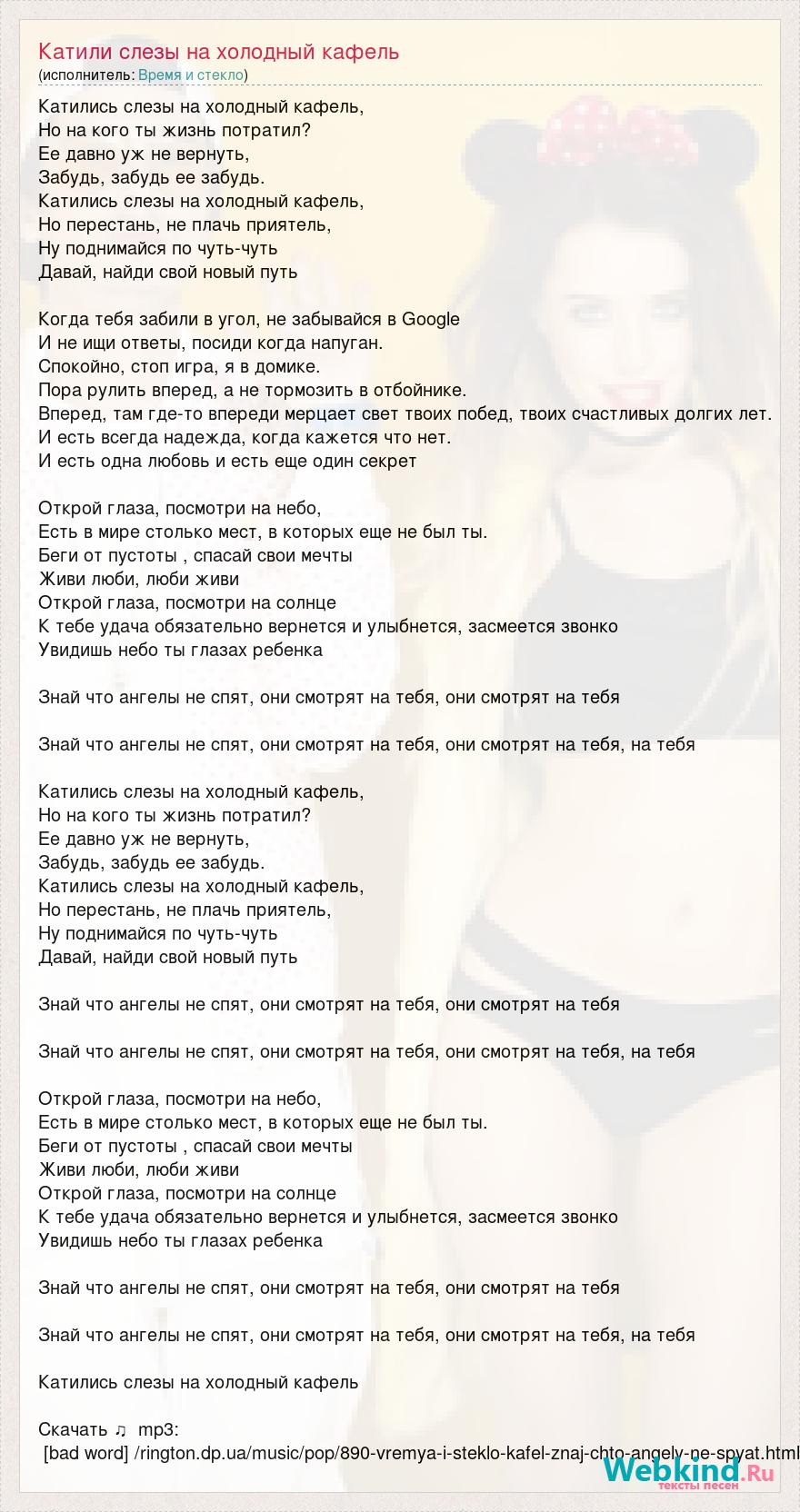 Катились слезы на холодный кафель, Но на кого ты жизнь потратил? Ее давно уж не вернуть, Забудь, забудь ее забудь. Катились слезы на холодный кафель, Но перестань, не плачь приятель, Ну поднимайся по чуть-чуть Давай, найди свой новый путь Когда тебя забили в угол, не забывайся в Google И не ищи ответы, посиди когда напуган. Спокойно, стоп игра, я в домике. Пора рулить вперед, а не тормозить в отбойнике. Вперед, там где-то впереди мерцает свет твоих побед, твоих счастливых долгих лет. И есть всегда надежда, когда кажется что нет. И есть одна любовь и есть еще один секрет Открой глаза, посмотри на небо, Есть в мире столько мест, в которых еще не был ты. Беги от пустоты , спасай свои мечты Живи люби, люби живи Открой глаза, посмотри на солнце К тебе удача обязательно вернется и улыбнется, засмеется звонко Увидишь небо ты глазах ребенка Знай что ангелы не спят, они смотрят на тебя, они смотрят на тебя Знай что ангелы не спят, они смотрят на тебя, они смотрят на тебя, на тебя Катились слезы на холодный кафель, Но на кого ты жизнь потратил? Ее давно уж не вернуть, Забудь, забудь ее забудь. Катились слезы на холодный кафель, Но перестань, не плачь приятель, Ну поднимайся по чуть-чуть Давай, найди свой новый путь Знай что ангелы не спят, они смотрят на тебя, они смотрят на тебя Знай что ангелы не спят, они смотрят на тебя, они смотрят на тебя, на тебя Открой глаза, посмотри на небо, Есть в мире столько мест, в которых еще не был ты. Беги от пустоты , спасай свои мечты Живи люби, люби живи Открой глаза, посмотри на солнце К тебе удача обязательно вернется и улыбнется, засмеется звонко Увидишь небо ты глазах ребенка Знай что ангелы не спят, они смотрят на тебя, они смотрят на тебя Знай что ангелы не спят, они смотрят на тебя, они смотрят на тебя, на тебя Катились слезы на холодный кафель Скачать ♫ mp3: [bad word] /rington.dp.ua/music/pop/890-vremya-i-steklo-kafel-znaj-chto-angely-ne-spyat.html