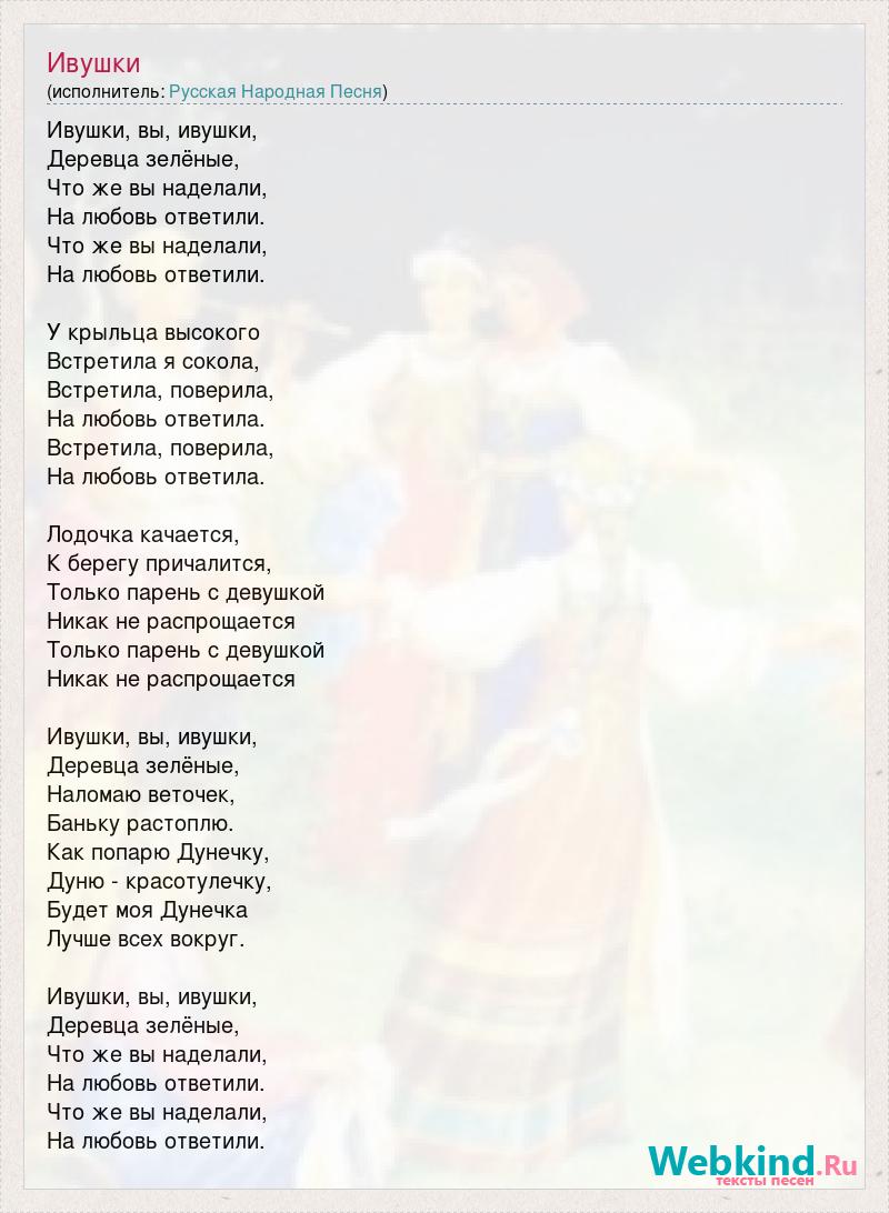 Ивушки, вы, ивушки, Деревца зелёные, Что же вы наделали, На любовь ответили. Что же вы наделали, На любовь ответили. У крыльца высокого Встретила я сокола, Встретила, поверила, На любовь ответила. Встретила, поверила, На любовь ответила. Лодочка качается, К берегу причалится, Только парень с девушкой Никак не распрощается Только парень с девушкой Никак не распрощается Ивушки, вы, ивушки, Деревца зелёные, Наломаю веточек, Баньку растоплю. Как попарю Дунечку, Дуню - красотулечку, Будет моя Дунечка Лучше всех вокруг. Ивушки, вы, ивушки, Деревца зелёные, Что же вы наделали, На любовь ответили. Что же вы наделали, На любовь ответили.