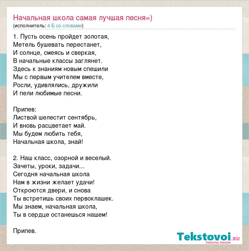 1. Пусть осень пройдет золотая, Метель бушевать перестанет, И солнце, смеясь и сверкая, В начальные классы заглянет. Здесь к знаниям новым спешили Мы с первым учителем вместе, Росли, удивлялись, дружили И пели любимые песни. Припев: Листвой шелестит сентябрь, И вновь расцветает май. Мы будем любить тебя, Начальная школа, знай! 2. Наш класс, озорной и веселый. Зачеты, уроки, задачи... Сегодня начальная школа Нам в жизни желает удачи! Откроются двери, и снова Ты встретишь своих первоклашек. Мы знаем, начальная школа, Ты в сердце останешься нашем! Припев.