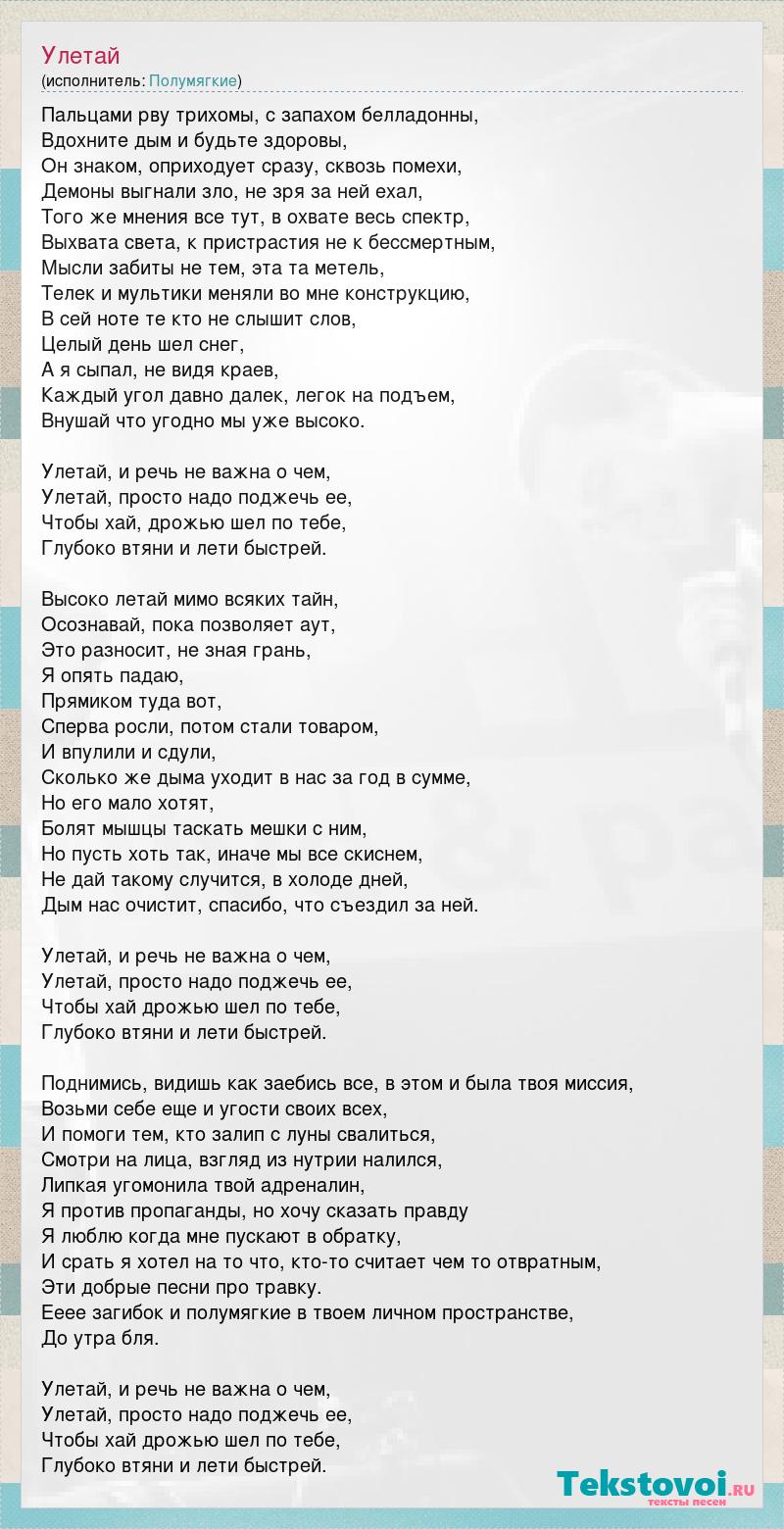 Пальцами рву трихомы, с запахом белладонны, Вдохните дым и будьте здоровы, Он знаком, оприходует сразу, сквозь помехи, Демоны выгнали зло, не зря за ней ехал, Того же мнения все тут, в охвате весь спектр, Выхвата света, к пристрастия не к бессмертным, Мысли забиты не тем, эта та метель, Телек и мультики меняли во мне конструкцию, В сей ноте те кто не слышит слов, Целый день шел снег, А я сыпал, не видя краев, Каждый угол давно далек, легок на подъем, Внушай что угодно мы уже высоко. Улетай, и речь не важна о чем, Улетай, просто надо поджечь ее, Чтобы хай, дрожью шел по тебе, Глубоко втяни и лети быстрей. Высоко летай мимо всяких тайн, Осознавай, пока позволяет аут, Это разносит, не зная грань, Я опять падаю, Прямиком туда вот, Сперва росли, потом стали товаром, И впулили и сдули, Сколько же дыма уходит в нас за год в сумме, Но его мало хотят, Болят мышцы таскать мешки с ним, Но пусть хоть так, иначе мы все скиснем, Не дай такому случится, в холоде дней, Дым нас очистит, спасибо, что съездил за ней. Улетай, и речь не важна о чем, Улетай, просто надо поджечь ее, Чтобы хай дрожью шел по тебе, Глубоко втяни и лети быстрей. Поднимись, видишь как заебись все, в этом и была твоя миссия, Возьми себе еще и угости своих всех, И помоги тем, кто залип с луны свалиться, Смотри на лица, взгляд из нутрии налился, Липкая угомонила твой адреналин, Я против пропаганды, но хочу сказать правду Я люблю когда мне пускают в обратку, И срать я хотел на то что, кто-то считает чем то отвратным, Эти добрые песни про травку. Ееее загибок и полумягкие в твоем личном пространстве, До утра бля. Улетай, и речь не важна о чем, Улетай, просто надо поджечь ее, Чтобы хай дрожью шел по тебе, Глубоко втяни и лети быстрей.