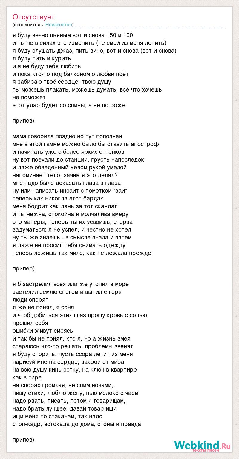 я буду вечно пьяным вот и снова 150 и 100 и ты не в силах это изменить (не смей из меня лепить) я буду слушать джаз, пить вино, вот и снова (вот и снова) я буду пить и курить и я не буду тебя любить и пока кто-то под балконом о любви поёт я забираю твоё сердце, твою душу ты можешь плакать, можешь думать, всё что хочешь не поможет этот удар будет со спины, а не по роже припев) мама говорила поздно но тут попознан мне в этой гамме можно было бы ставить апостроф и начинать уже с более ярких оттенков ну вот поехали до станции, грусть напоследок и даже обведенный мелом рукой умелой напоминает тело, зачем я это делал? мне надо было доказать глаза в глаза ну или написать инсайт с пометкой "зай" теперь как никогда этот бардак меня бодрит как дань за тот скандал и ты нежна, спокойна и молчалива вмеру это манеры, теперь ты их усвоишь, стерва задуматься: я не успел, и честно не хотел ну ты же знаешь...в смысле знала и затем я даже не просил тебя снимать одежду теперь лежишь так мило, как не лежала прежде припер) я б застрелил всех или же утопил в море застелил землю снегом и выпил с горя люди спорят я же не понял, я соня и чтоб добиться этих глаз прошу кровь с солью прошил себя ошибки живут смеясь и так бы не понял, кто я, но а жизнь змея стараюсь что-то решать, проблемы звенят я буду спорить, пусть ссора летит из меня нарисуй мне на сердце, закрой от мира на всю душу кинь сетку, на ключ в квартире как в тире на спорах громкая, не спим ночами, пишу стихи, люблю жену, пью молоко с чаем надо рвать, писать, потом к товарищам, надо брать лучшее. давай товар ищи ищи меня по стаканам, так надо стоп-кадр, эстокада до дома, стоны и правда припев)