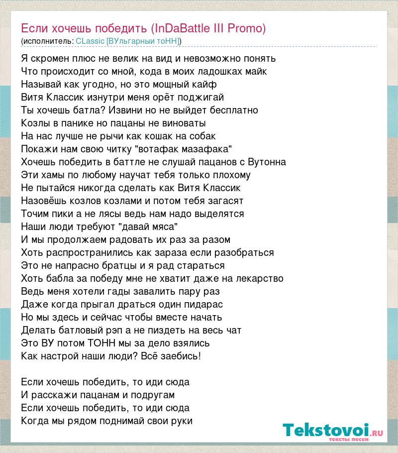 Я скромен плюс не велик на вид и невозможно понять Что происходит со мной, кода в моих ладошках майк Называй как угодно, но это мощный кайф Витя Классик изнутри меня орёт поджигай Ты хочешь батла? Извини но не выйдет бесплатно Козлы в панике но пацаны не виноваты На нас лучше не рычи как кошак на собак Покажи нам свою читку "вотафак мазафака" Хочешь победить в баттле не слушай пацанов с Вутонна Эти хамы по любому научат тебя только плохому Не пытайся никогда сделать как Витя Классик Назовёшь козлов козлами и потом тебя загасят Точим пики а не лясы ведь нам надо выделятся Наши люди требуют "давай мяса" И мы продолжаем радовать их раз за разом Хоть распространились как зараза если разобраться Это не напрасно братцы и я рад стараться Хоть бабла за победу мне не хватит даже на лекарство Ведь меня хотели гады завалить пару раз Даже когда прыгал драться один пидарас Но мы здесь и сейчас чтобы вместе начать Делать батловый рэп а не пиздеть на весь чат Это ВУ потом ТОНН мы за дело взялись Как настрой наши люди? Всё заебись! Если хочешь победить, то иди сюда И расскажи пацанам и подругам Если хочешь победить, то иди сюда Когда мы рядом поднимай свои руки