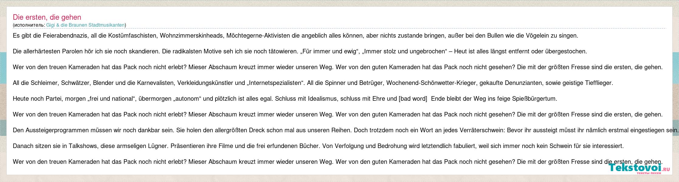 Es gibt die Feierabendnazis, all die Kostümfaschisten, Wohnzimmerskinheads, Möchtegerne-Aktivisten die angeblich alles können, aber nichts zustande bringen, außer bei den Bullen wie die Vögelein zu singen. Die allerhärtesten Parolen hör ich sie noch skandieren. Die radikalsten Motive seh ich sie noch tätowieren. „Für immer und ewig“, „Immer stolz und ungebrochen“ – Heut ist alles längst entfernt oder übergestochen. Wer von den treuen Kameraden hat das Pack noch nicht erlebt? Mieser Abschaum kreuzt immer wieder unseren Weg. Wer von den guten Kameraden hat das Pack noch nicht gesehen? Die mit der größten Fresse sind die ersten, die gehen. All die Schleimer, Schwätzer, Blender und die Karnevalisten, Verkleidungskünstler und „Internetspezialisten“. All die Spinner und Betrüger, Wochenend-Schönwetter-Krieger, gekaufte Denunzianten, sowie geistige Tiefflieger. Heute noch Partei, morgen „frei und national“, übermorgen „autonom“ und plötzlich ist alles egal. Schluss mit Idealismus, schluss mit Ehre und mit Ruhm. Ende bleibt der Weg ins feige Spießbürgertum. Wer von den treuen Kameraden hat das Pack noch nicht erlebt? Mieser Abschaum kreuzt immer wieder unseren Weg. Wer von den guten Kameraden hat das Pack noch nicht gesehen? Die mit der größten Fresse sind die ersten, die gehen. Den Aussteigerprogrammen müssen wir noch dankbar sein. Sie holen den allergrößten Dreck schon mal aus unseren Reihen. Doch trotzdem noch ein Wort an jedes Verräterschwein: Bevor ihr aussteigt müsst ihr nämlich erstmal eingestiegen sein. Danach sitzen sie in Talkshows, diese armseligen Lügner. Präsentieren ihre Filme und die frei erfundenen Bücher. Von Verfolgung und Bedrohung wird letztendlich fabuliert, weil sich immer noch kein Schwein für sie interessiert. Wer von den treuen Kameraden hat das Pack noch nicht erlebt? Mieser Abschaum kreuzt immer wieder unseren Weg. Wer von den guten Kameraden hat das Pack noch nicht gesehen? Die mit der größten Fresse sind die ersten, die gehen.