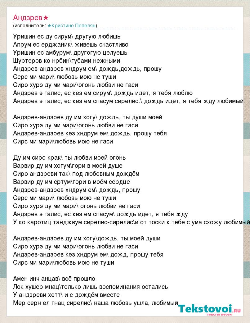 Уришин ес ду сирум\ другую любишь Апрум ес ерджаник\ живешь счастливо Уришин ес амбурум\ другогую целуешь Шуртеров ко нрбин\губами нежными Андзрев-андзрев хндрум ем\ дождь,дождь, прошу Серс ми мари\ любовь мою не туши Сиро хурэ ду ми мари\огонь любви не гаси Андзрев э галис, ес кез ем сирум\ дождь идет, я тебя люблю Андзрев э галис, ес кез ем спасум сирелис.\ дождь идет, я тебя жду любимый Андзрев-андзрев ду им хогу\ дождь, ты души моей Сиро хурэ ду ми мари\огонь любви не гаси Андзрев-андзрев кез хндрум ем\ дождь, прошу тебя Сирс ми мари\любовь мою не гаси Ду им сиро крак\ ты любви моей огонь Варвир ду им хогум\гори в моей душе Сиро андзреви так\ под любовным дождём Варвир ду им сртум\гори в моём сердце Андзрев-андзрев хндрум ем\ дождь, прошу Серс ми мари\ любовь мою не туши Сиро хурэ ду ми мари\ огонь любви не гаси Андзрев э галис, ес кез ем спасум\ дождь идет, я тебя жду У ко каротиц танджвум сирелис-сирелис\и от тоски к тебе с ума схожу любимый Андзрев-андзрев ду им хогу\дождь, ты моей души Сиро хурэ ду ми мари\огонь любви не гаси Андзрев-андзрев кез хндрум ем\ дожд, прошу тебя Сирс ми мари\любовь мою не туши Амен инч анцав\ всё прошло Лок хушер мнац\только лишь воспоминания остались У андзреви хетт\ и с дождём вместе Мер серн ел гнац сирелис\ наша любовь ушла, любимый
