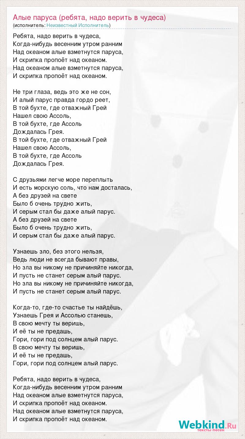 Ребята, надо верить в чудеса, Когда-нибудь весенним утром ранним Над океаном алые взметнутся паруса, И скрипка пропоёт над океаном. Над океаном алые взметнутся паруса, И скрипка пропоёт над океаном. Не три глаза, ведь это же не сон, И алый парус правда гордо реет, В той бухте, где отважный Грей Нашел свою Ассоль, В той бухте, где Ассоль Дождалась Грея. В той бухте, где отважный Грей Нашел свою Ассоль, В той бухте, где Ассоль Дождалась Грея. С друзьями легче море переплыть И есть морскую соль, что нам досталась, А без друзей на свете Было б очень трудно жить, И серым стал бы даже алый парус. А без друзей на свете Было б очень трудно жить, И серым стал бы даже алый парус. Узнаешь зло, без этого нельзя, Ведь люди не всегда бывают правы, Но зла вы никому не причиняйте никогда, И пусть не станет серым алый парус. Но зла вы никому не причиняйте никогда, И пусть не станет серым алый парус. Когда-то, где-то счастье ты найдёшь, Узнаешь Грея и Ассолью станешь, В свою мечту ты веришь, И её ты не предашь, Гори, гори под солнцем алый парус. В свою мечту ты веришь, И её ты не предашь, Гори, гори под солнцем алый парус. Ребята, надо верить в чудеса, Когда-нибудь весенним утром ранним Над океаном алые взметнутся паруса, И скрипка пропоёт над океаном. Над океаном алые взметнутся паруса, И скрипка пропоёт над океаном.