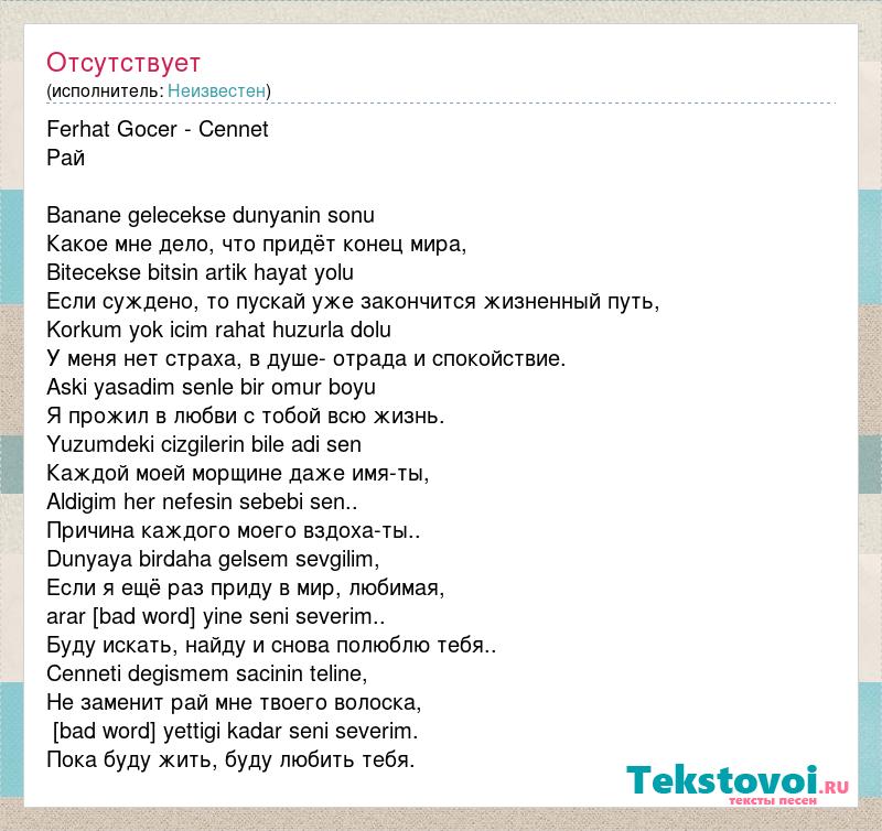 Ferhat Gocer - Cennet Рай Banane gelecekse dunyanin sonu Какое мне дело, что придёт конец мира, Bitecekse bitsin artik hayat yolu Если суждено, то пускай уже закончится жизненный путь, Korkum yok icim rahat huzurla dolu У меня нет страха, в душе- отрада и спокойствие. Aski yasadim senle bir omur boyu Я прожил в любви с тобой всю жизнь. Yuzumdeki cizgilerin bile adi sen Каждой моей морщине даже имя-ты, Aldigim her nefesin sebebi sen.. Причина каждого моего вздоха-ты.. Dunyaya birdaha gelsem sevgilim, Если я ещё раз приду в мир, любимая, arar bulurum yine seni severim.. Буду искать, найду и снова полюблю тебя.. Cenneti degismem sacinin teline, Не заменит рай мне твоего волоска, omrumun yettigi kadar seni severim. Пока буду жить, буду любить тебя.