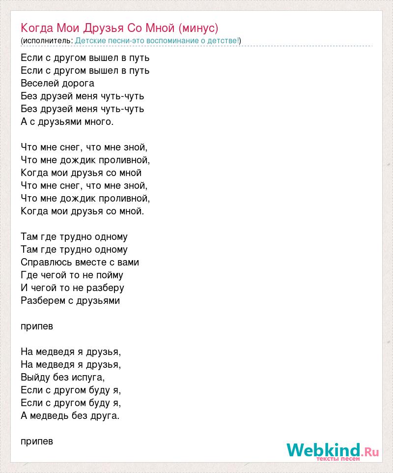 Если с другом вышел в путь Если с другом вышел в путь Веселей дорога Без друзей меня чуть-чуть Без друзей меня чуть-чуть А с друзьями много. Что мне снег, что мне зной, Что мне дождик проливной, Когда мои друзья со мной Что мне снег, что мне зной, Что мне дождик проливной, Когда мои друзья со мной. Там где трудно одному Там где трудно одному Справлюсь вместе с вами Где чегой то не пойму И чегой то не разберу Разберем с друзьями припев На медведя я друзья, На медведя я друзья, Выйду без испуга, Если с другом буду я, Если с другом буду я, А медведь без друга. припев