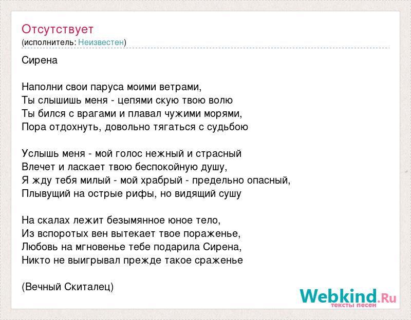 Сирена Наполни свои паруса моими ветрами, Ты слышишь меня - цепями скую твою волю Ты бился с врагами и плавал чужими морями, Пора отдохнуть, довольно тягаться с судьбою Услышь меня - мой голос нежный и страсный Влечет и ласкает твою беспокойную душу, Я жду тебя милый - мой храбрый - предельно опасный, Плывущий на острые рифы, но видящий сушу На скалах лежит безымянное юное тело, Из вспоротых вен вытекает твое пораженье, Любовь на мгновенье тебе подарила Сирена, Никто не выигрывал прежде такое сраженье (Вечный Скиталец)