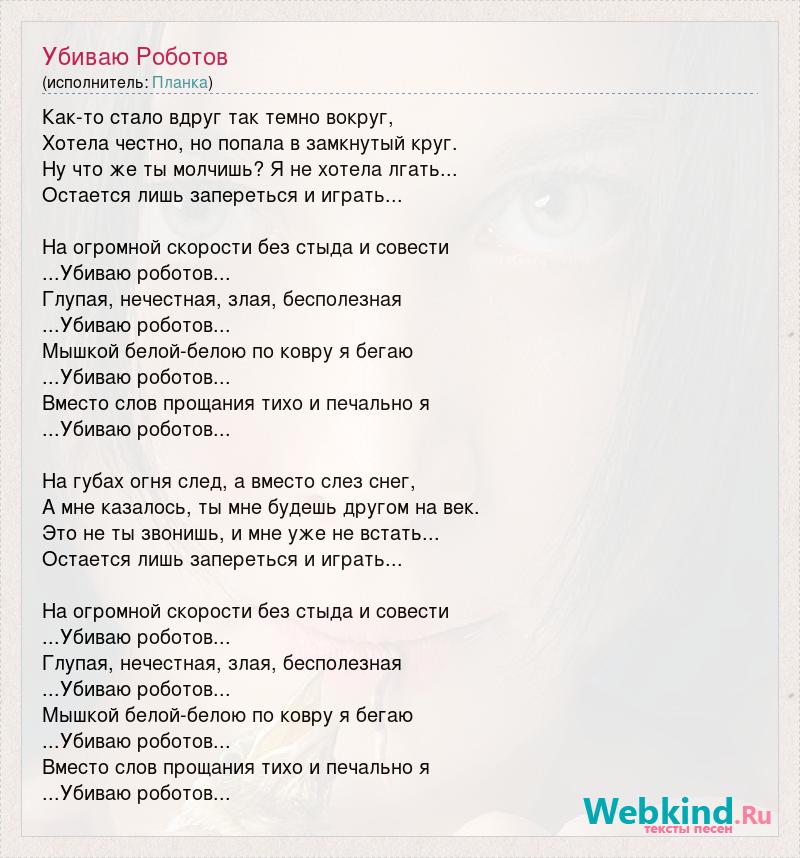 Как-то стало вдруг так темно вокруг, Хотела честно, но попала в замкнутый круг. Ну что же ты молчишь? Я не хотела лгать... Остается лишь запереться и играть... На огромной скорости без стыда и совести ...Убиваю роботов... Глупая, нечестная, злая, бесполезная ...Убиваю роботов... Мышкой белой-белою по ковру я бегаю ...Убиваю роботов... Вместо слов прощания тихо и печально я ...Убиваю роботов... На губах огня след, а вместо слез снег, А мне казалось, ты мне будешь другом на век. Это не ты звонишь, и мне уже не встать... Остается лишь запереться и играть... На огромной скорости без стыда и совести ...Убиваю роботов... Глупая, нечестная, злая, бесполезная ...Убиваю роботов... Мышкой белой-белою по ковру я бегаю ...Убиваю роботов... Вместо слов прощания тихо и печально я ...Убиваю роботов...