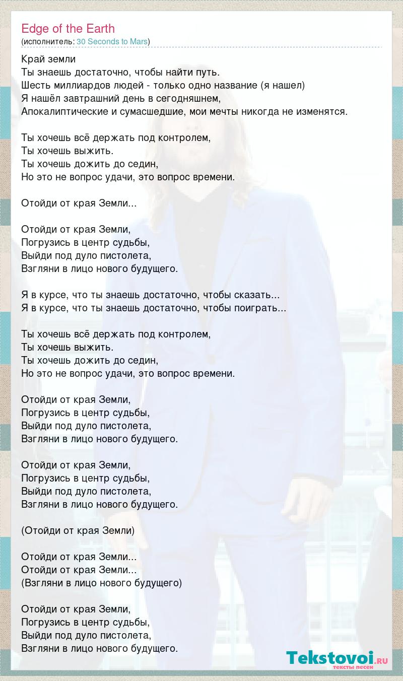 Край земли Ты знаешь достаточно, чтобы найти путь. Шесть миллиардов людей - только одно название (я нашел) Я нашёл завтрашний день в сегодняшнем, Апокалиптические и сумасшедшие, мои мечты никогда не изменятся. Ты хочешь всё держать под контролем, Ты хочешь выжить. Ты хочешь дожить до седин, Но это не вопрос удачи, это вопрос времени. Отойди от края Земли... Отойди от края Земли, Погрузись в центр судьбы, Выйди под дуло пистолета, Взгляни в лицо нового будущего. Я в курсе, что ты знаешь достаточно, чтобы сказать... Я в курсе, что ты знаешь достаточно, чтобы поиграть... Ты хочешь всё держать под контролем, Ты хочешь выжить. Ты хочешь дожить до седин, Но это не вопрос удачи, это вопрос времени. Отойди от края Земли, Погрузись в центр судьбы, Выйди под дуло пистолета, Взгляни в лицо нового будущего. Отойди от края Земли, Погрузись в центр судьбы, Выйди под дуло пистолета, Взгляни в лицо нового будущего. (Отойди от края Земли) Отойди от края Земли... Отойди от края Земли... (Взгляни в лицо нового будущего) Отойди от края Земли, Погрузись в центр судьбы, Выйди под дуло пистолета, Взгляни в лицо нового будущего.