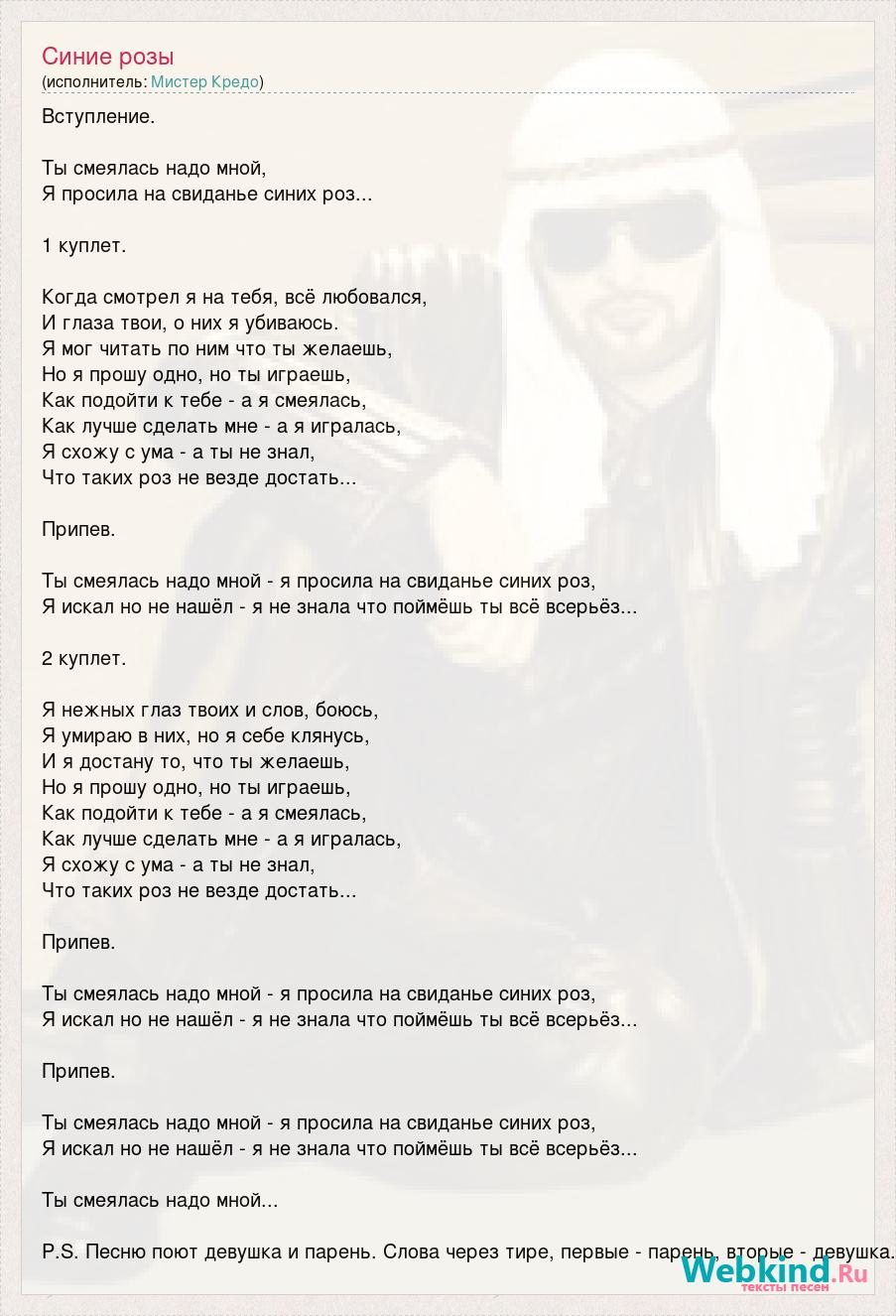 Вступление. Ты смеялась надо мной, Я просила на свиданье синих роз... 1 куплет. Когда смотрел я на тебя, всё любовался, И глаза твои, о них я убиваюсь. Я мог читать по ним что ты желаешь, Но я прошу одно, но ты играешь, Как подойти к тебе - а я смеялась, Как лучше сделать мне - а я игралась, Я схожу с ума - а ты не знал, Что таких роз не везде достать... Припев. Ты смеялась надо мной - я просила на свиданье синих роз, Я искал но не нашёл - я не знала что поймёшь ты всё всерьёз... 2 куплет. Я нежных глаз твоих и слов, боюсь, Я умираю в них, но я себе клянусь, И я достану то, что ты желаешь, Но я прошу одно, но ты играешь, Как подойти к тебе - а я смеялась, Как лучше сделать мне - а я игралась, Я схожу с ума - а ты не знал, Что таких роз не везде достать... Припев. Ты смеялась надо мной - я просила на свиданье синих роз, Я искал но не нашёл - я не знала что поймёшь ты всё всерьёз... Припев. Ты смеялась надо мной - я просила на свиданье синих роз, Я искал но не нашёл - я не знала что поймёшь ты всё всерьёз... Ты смеялась надо мной... P.S. Песню поют девушка и парень. Слова через тире, первые - парень, вторые - девушка.